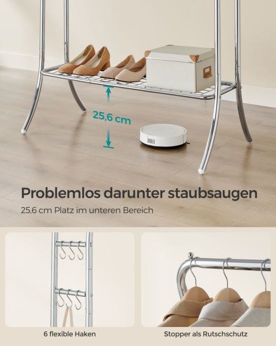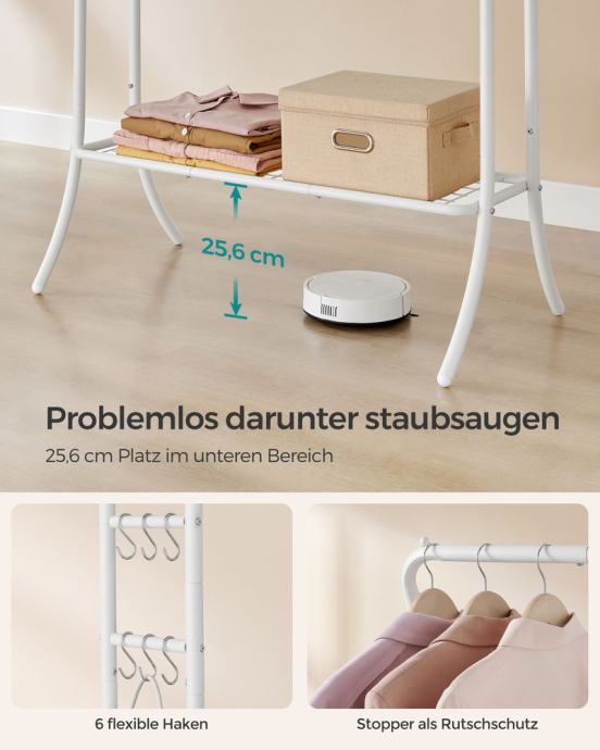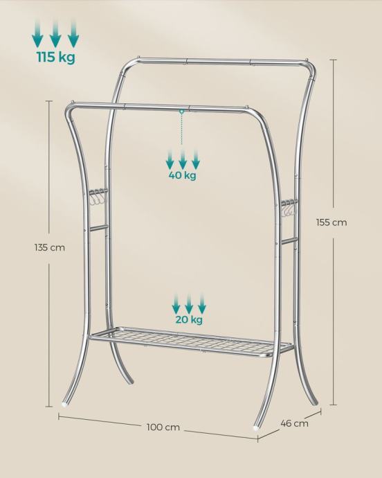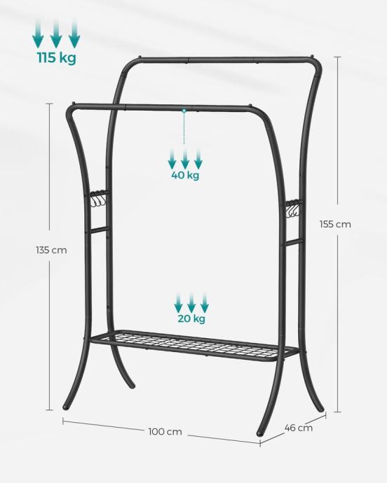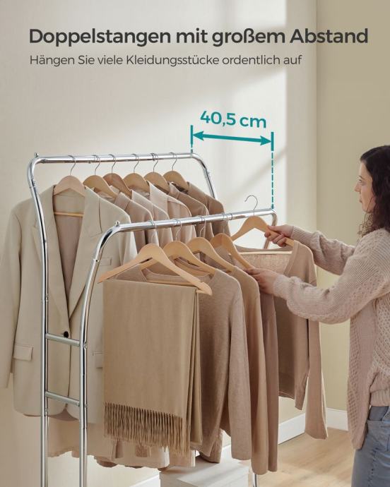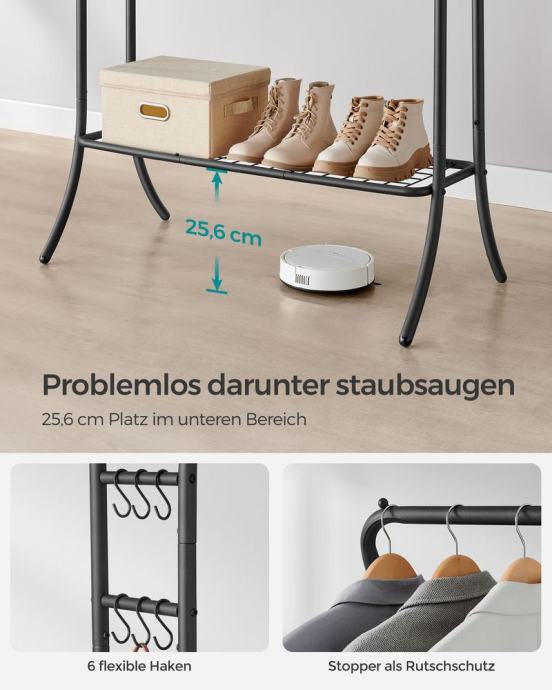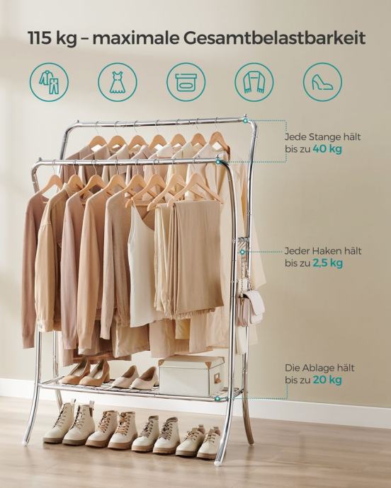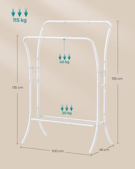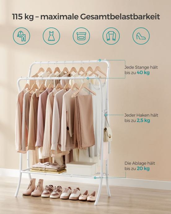 Ovaj stalak ima visoku i nisku šipku za odjeću različitih duljina, 6 kukica za torbe i šešire te policu za kutije i cipele. Tako da svoje stvari uvijek možete držati urednima! Čelične cijevi (Ø 25,4 mm) čine ovu vješalicu čvrstom i pouzdanom. Također nude stabilan okvir nosivosti do 115 kg, tako da svoju odjeću možete objesiti bez brige. Zahvaljujući jednostavnoj strukturi, označenim dijelovima i uputama koje je lako slijediti, ovaj metalni stalak za odjeću postavljen je i spreman za upotrebu u tren oka. Sa svojim dvostrukim policama za kapute, ova prijenosna polica za kapute nudi mnogo prostora za pohranu vaše odjeće, omogućujući vam da jednostavno objesite oko 70 odjeće. Nema više hrpe odjeće! Čiste linije i minimalistička silueta ovog stalka za odjeću odišu daškom sofisticiranosti. Besprijekorno se uklapa u spavaće sobe, garderobe ili ulazne prostore i poboljšava cjelokupnu sliku. Za sve informacije nazovite na broj telefona 092/399-75-19