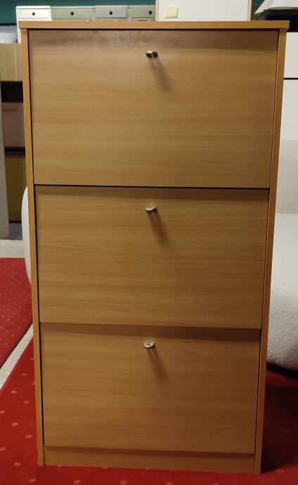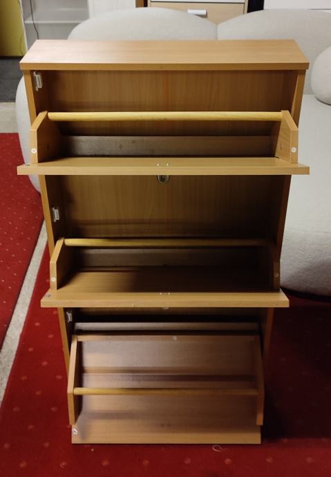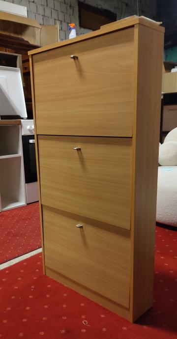 Prodajem cipelarnik s tri ladice u boji bukve. Svaka ladica otvara se prema dolje, što omogućuje jednostavan pristup obući. Ormarić je uskog profila pa ne zauzima puno prostora u predsoblje.