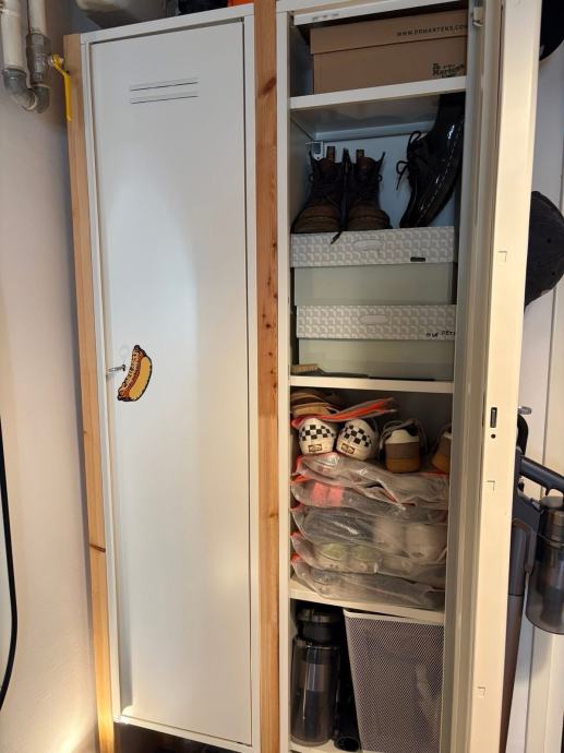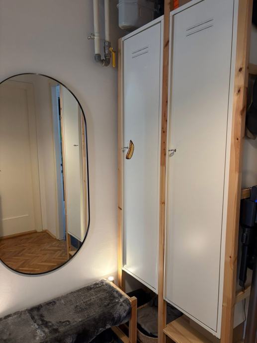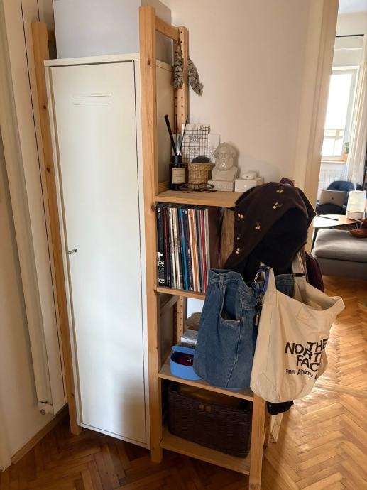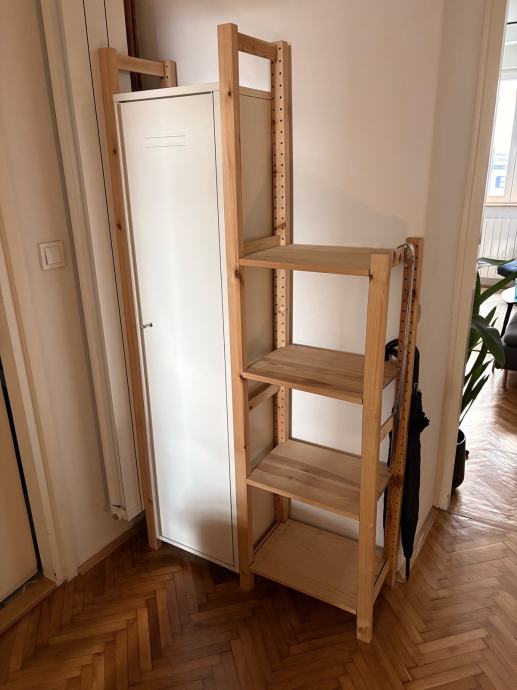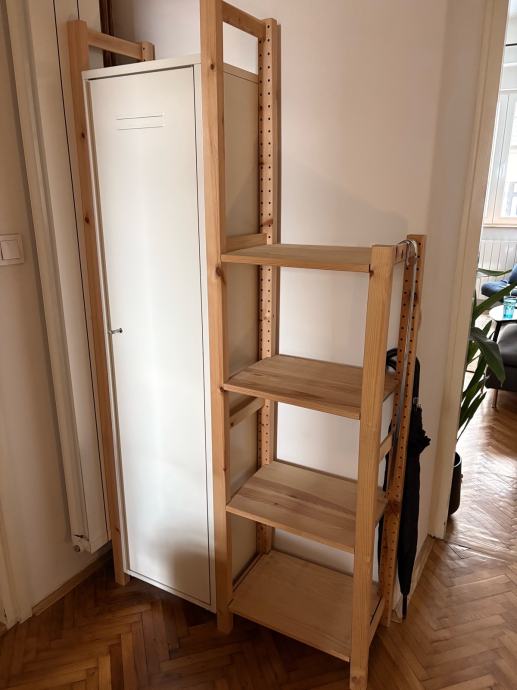 - IVAR sustav drvenih polica sa tri metalna ormarića. U cijeni poklanjam LINDBYN ogledalo i custom napravljenu klupicu za sjesti (i za odlaganje cipela) sa krznenim ikea tepihom i podloškom za cipele.