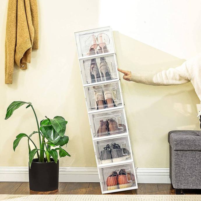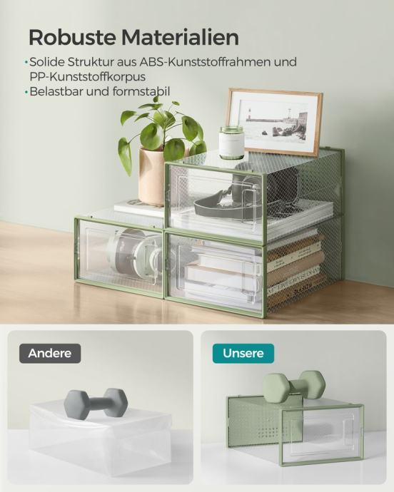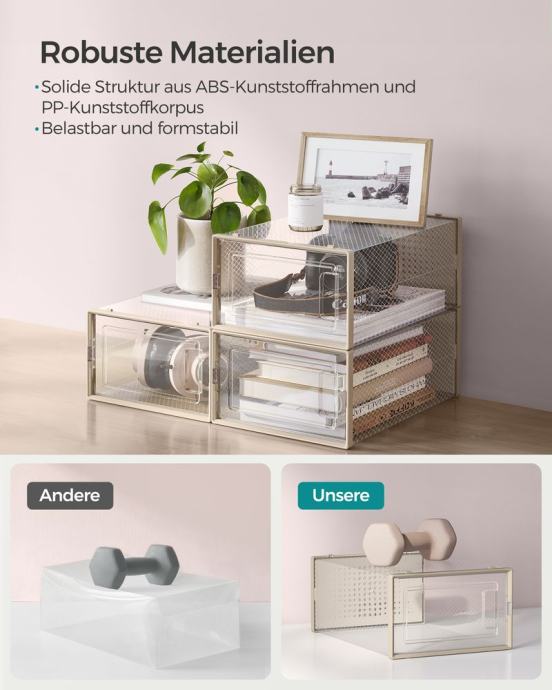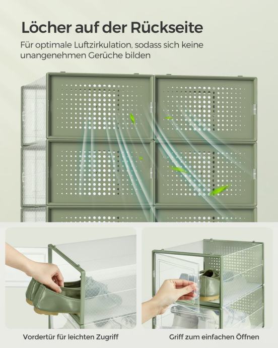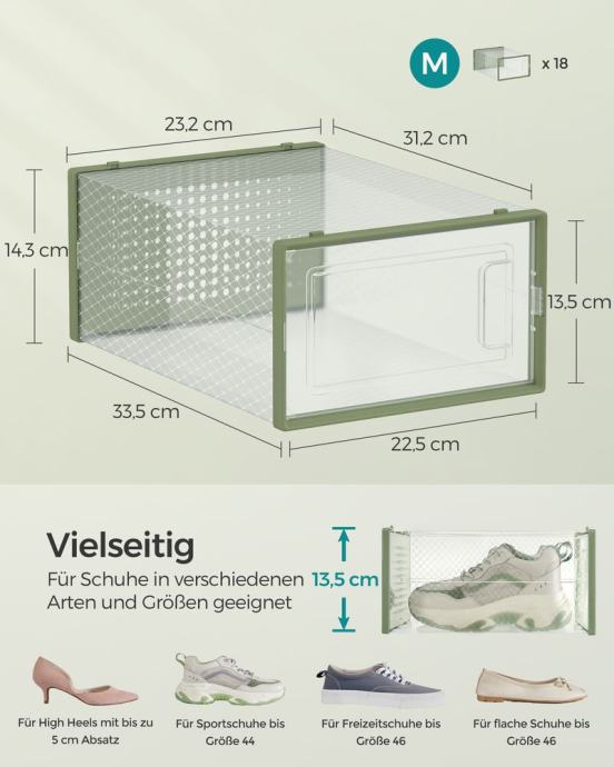 Sve što trebate učiniti je sastaviti 3 dijela (prednji dio, stražnji dio i tijelo) i imate novi organizator za cipele dimenzija 31 x 24,5 x 17,5 cm; konačno će sve vaše cipele do broja 44 naći svoje mjesto - tenisice, balerinke ili sandale? Nema problema! 18 sklopivih prozirnih kutija za cipele, koje imaju vrata i ventilacijske otvore i mogu se slagati jedna na drugu radi uštede prostora. S ovim praktičnim kutijama za cipele konačno možete reći zbogom kaosu u cipelama. Sada više ne morate otvarati sve kutije za cipele samo da biste pronašli par sportskih cipela - Prozirno tijelo i prozirna vrata ovih plastičnih kutija omogućuju vam da lako pronađete cipele pohranjene u kutijama - samo jedan pogled je dovoljno! Trebate li veliki sustav za pohranu? Izrezani dizajn gornje strane omogućuje stabilno slaganje više kutija jedne na drugu; ili biste htjeli staviti kutije za cipele jednu do druge? Nema ni problema! Bez obzira na to kako postavite kutije, praktični otvori za zrak uvijek osiguravaju da vaše cipele mogu disati. Za sve informacije nazovite na broj telefona 092/399-75-19