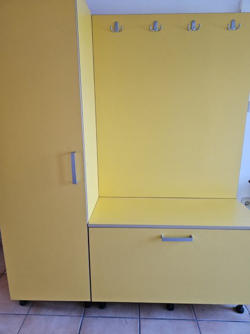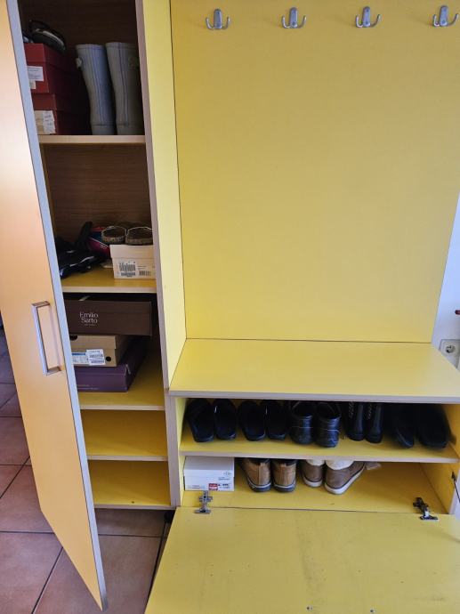 Ormar za cipele s vjesalicom izraden od iverala. S velikim brojem polica za cipele, te vecom povrsinom za kacanje. Dimenzije u cm: visina 182, sirina 150 i dubina 42. Rabljeno, prisutna ostecenja u unutarnjem dijelu. Vidljivo na fotografiji.