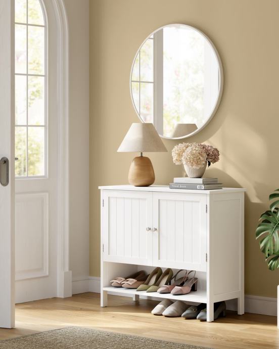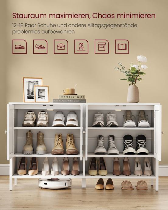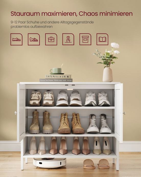 Uljepšajte svoj dom ovim modernim ormarićem za cipele. Sa svojim klasičnim dizajnom i škriljasto sivom bojom, može se lako integrirati u vaš stil interijera i unosi eleganciju u vašu sobu. S 9 rupa (svaka u razmacima od 3 cm) možete podesiti visinu polica iza vrata i smjestiti cipele različitih veličina. Osim toga, udaljenost od poda olakšava čišćenje. Upotrijebite stalak za cipele u ulaznom prostoru i hodniku za pohranjivanje cipela, u dnevnoj sobi za drangulije ili u radnoj sobi za pohranjivanje knjiga. Ovaj ormarić za pohranjivanje pravi je svestrani alat. Ovaj ormarić za cipele ima otvoreni pretinac i ormarić s ukupno 4 police, pružajući dovoljno prostora za pohranjivanje 9-12 pari cipela i drugih svakodnevnih stvari. Iskoristite svoj prostor maksimalno! Izrađen od čvrstih MDF ploča, ovaj ormarić za cipele nudi stabilnu strukturu koja može izdržati do 75 kg i osigurava izdržljivost. Uključena zaštita vrha također nudi dodatnu stabilnost. Za sve informacije nazovite na broj telefona 092/399-75-19