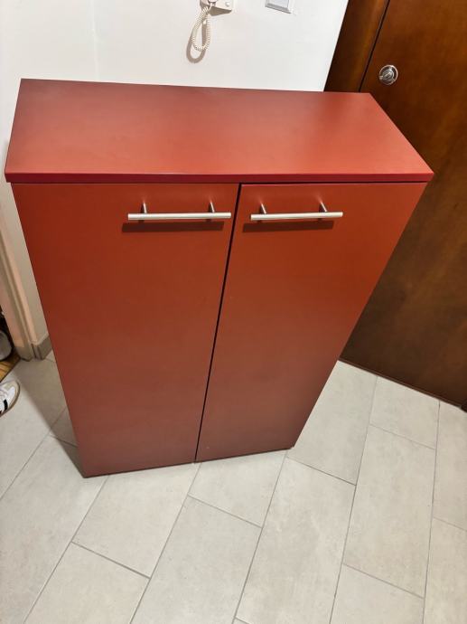 Prodajem ormarić za cipele u bordo boji s dvokrilnim vratima i metalnim ručkama srebrne boje. Unutar ormarića nalazi se pet polica koje nude zaista puno prostora za pohranu cipela. prikladan za predsoblje.