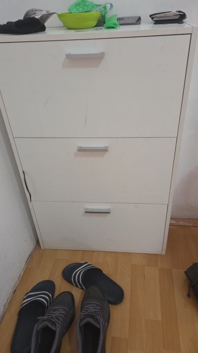 Prodajem ormarić za cipele bijele boje s tri pretinca na izvlačenje. Kompaktnih je dimenzija, prikladan za predsoblje. Izvlačni pretinci omogućuju uredno odlaganje cipela i štede prostor.