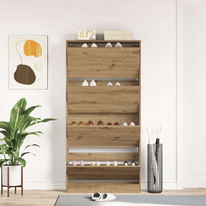 Ovaj ormarić za cipele s 4 ladice koje se spuštaju kombinira stil i funkciju, čineći tvoj hodnik ili dnevni prostor pametnijim uz mnogo prostora za pohranu. Njegovi teksturirani finiši od umjetnog hrasta dodaju moderan osjećaj i drže tvoje cipele organizirane, olakšavajući ti pristup i održavajući prostor urednim.