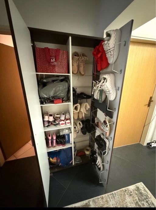 Poklanjam ormar za cipele Visina 184cm, Širina 83cm, Dubina 29cm. Sastoji se od lijevog i desnog dijela. U lijevom se nalaze 4 police, a u desnom se nalaze metalne pregrade za cipele. Ormar je masivan i kvalitetan.