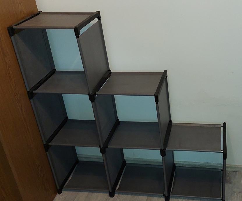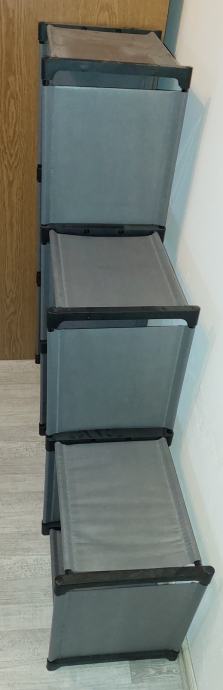 Modularna polica od kombinacije plastike i čvrstog tekstila. Dimenzije jednog odjeljka su 33x33 cm, ukupna širina je 109 cm (donji dio), ukupna visina je 106 cm (lijevi dio).Ako šaljem preko HP-a dolazi u rastavljenom stanju, nemam šemu sastavljanja, ali ću ju obilježiti brojevima prije rastavljanaj tako da se može lako sastaviti. moguća je i dostava Koprivnica i okolica ili na relaciji Koprivnica - Zagreb vikendom (ne svaki vikend i samo na mojoj ruti po dogovoru).
