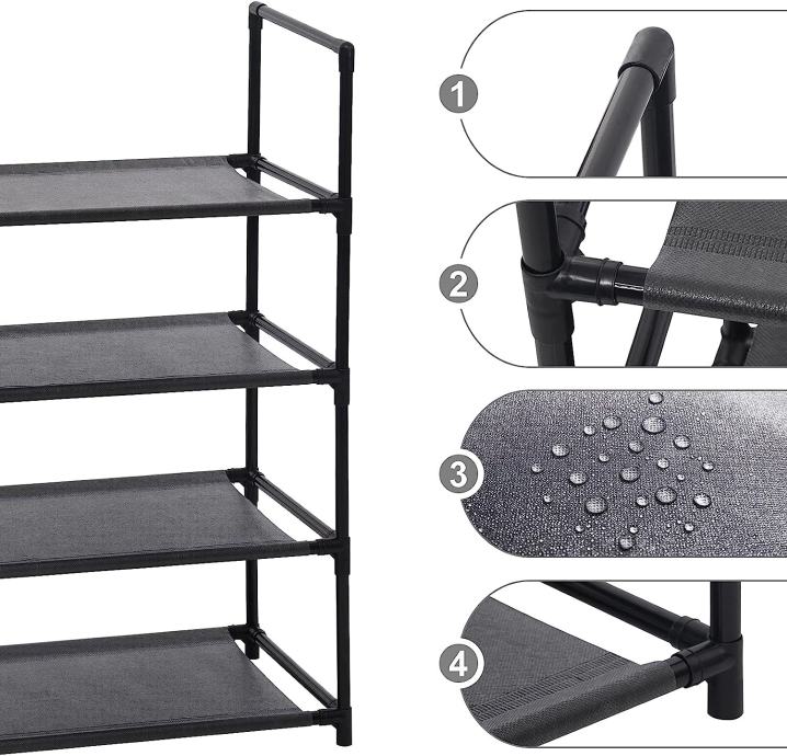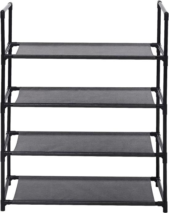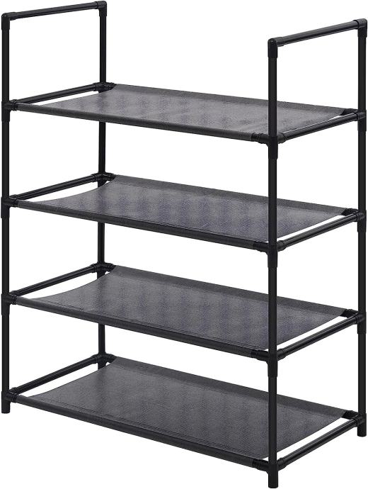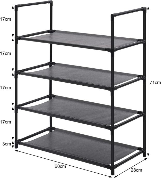 Ovaj stalak za cipele s četiri police pruža dovoljno prostora za organizaciju do 12 pari cipela ili drugih predmeta. Visina između polica iznosi 17 cm, a metalne šipke se mogu ukloniti za pohranu većih čizama.