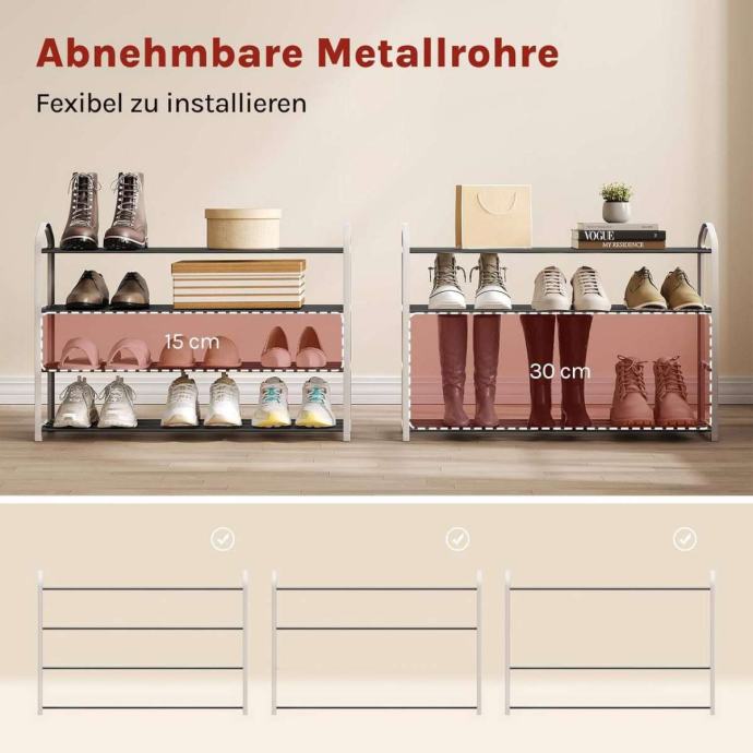 Visina između polica iznosi 17 cm, a svaka polica se može ukloniti prema potrebi. Time je omogućena pohrana viših čizama ili većih predmeta.