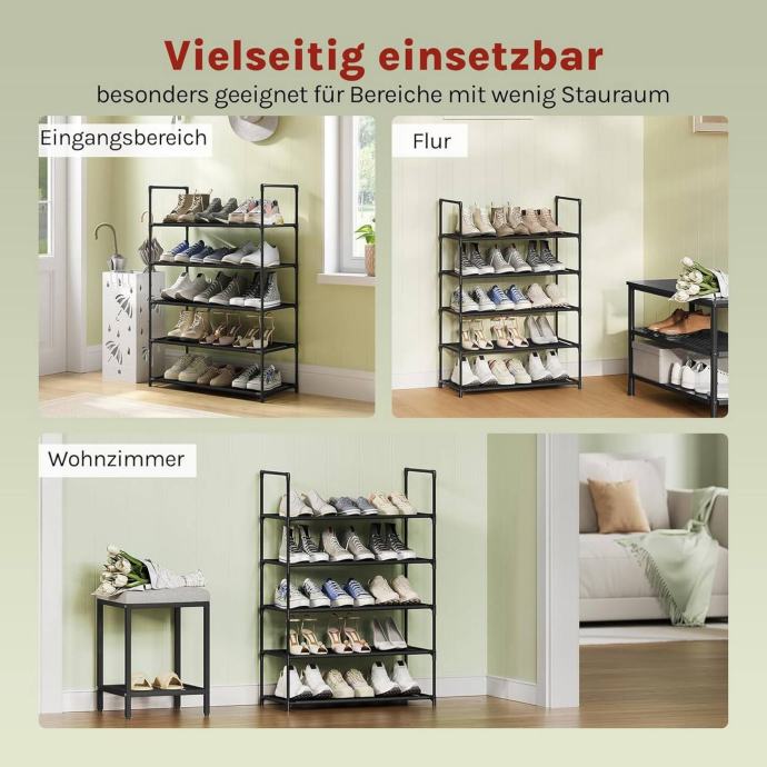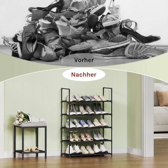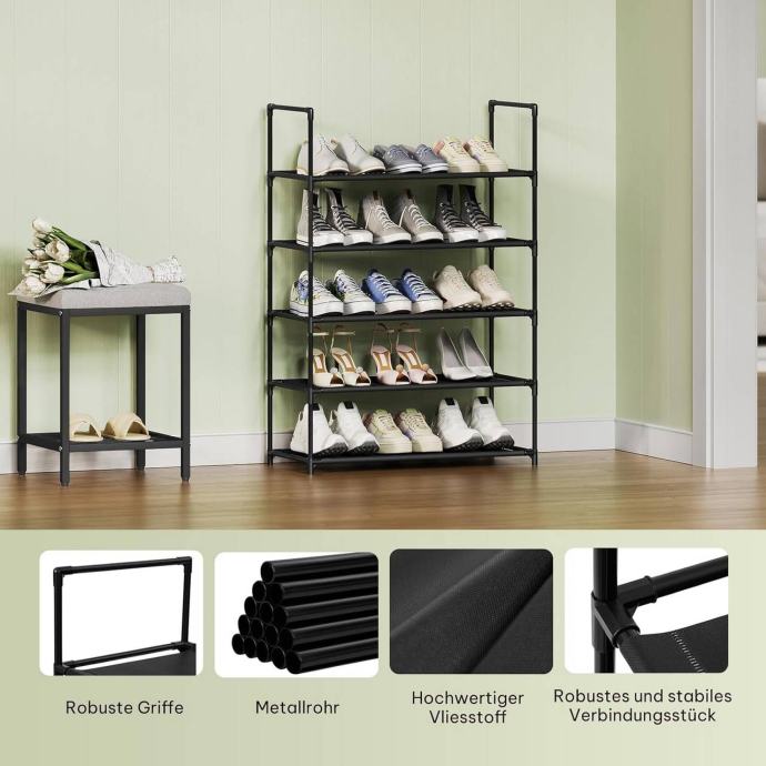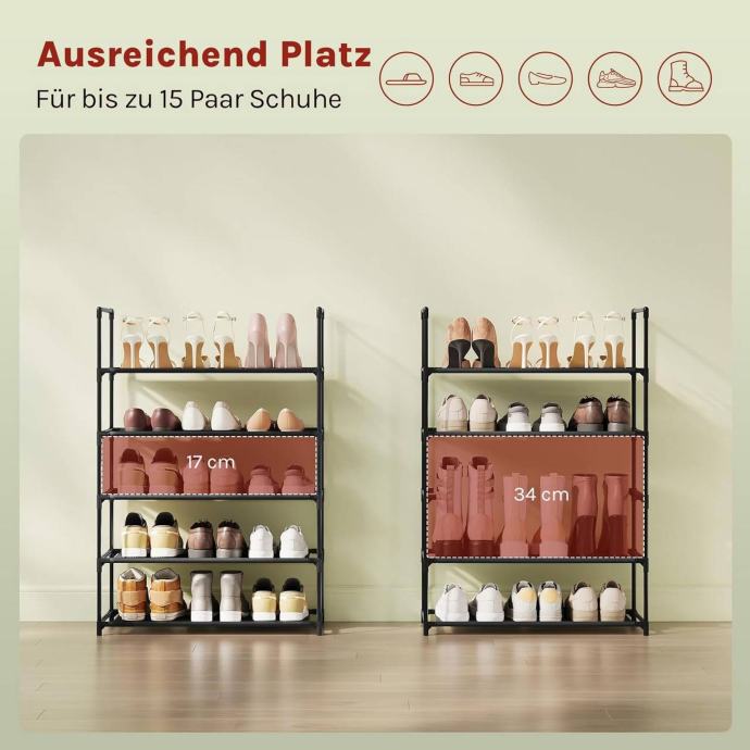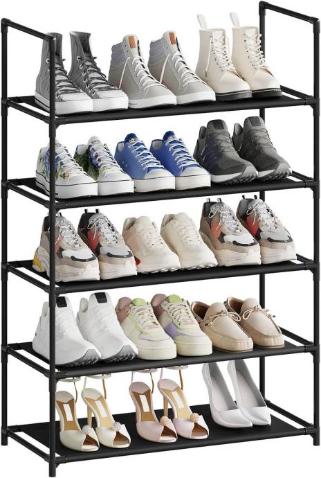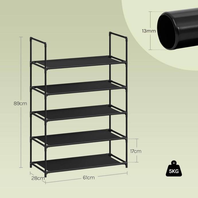 Ovaj stalak za cipele s 5 polica dizajniran je za maksimalnu uštedu prostora i funkcionalno pohranjivanje obuće. Zahvaljujući uskom i otvorenom dizajnu dimenzija 61 x 28 x 89 cm, idealan je za manje prostore i omogućuje optimalno iskorištavanje vertikalnog prostora. Na njega se može smjestiti do 15 pari cipela, a uklanjanjem jedne police moguće je pohraniti visoke čizme ili kutije za odlaganje.