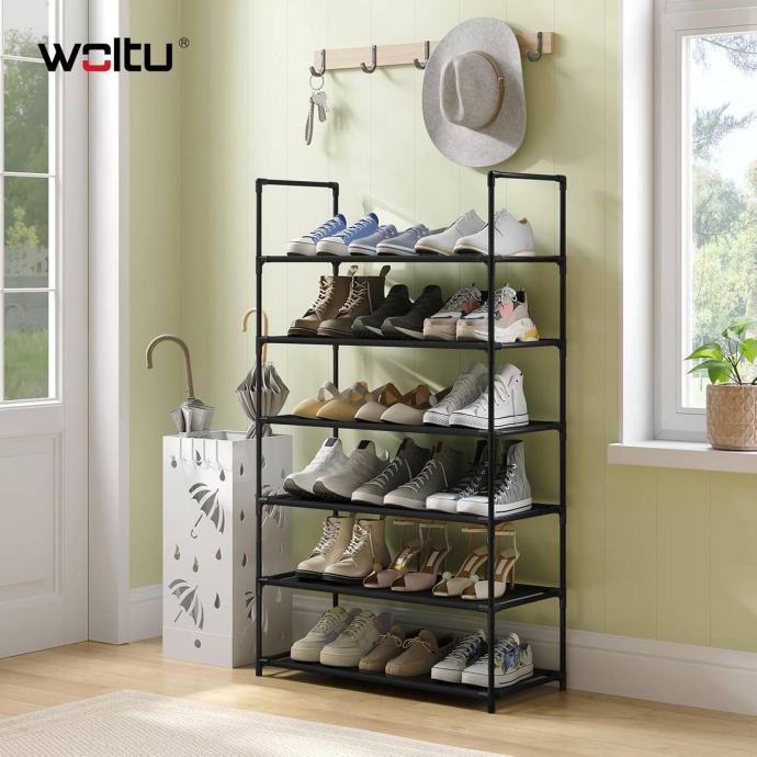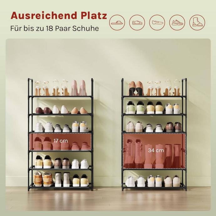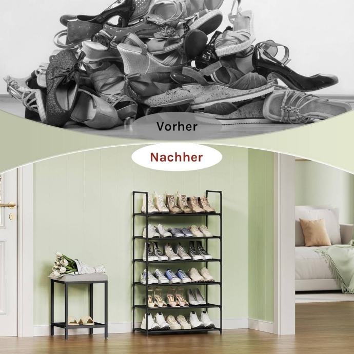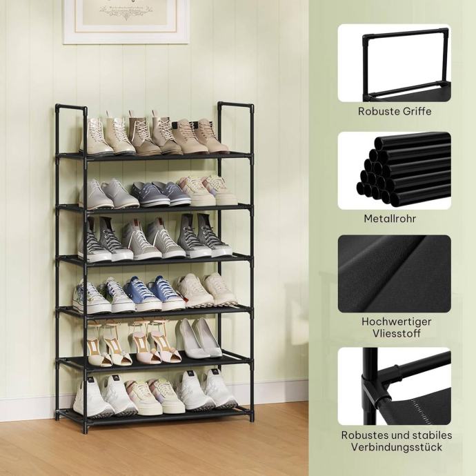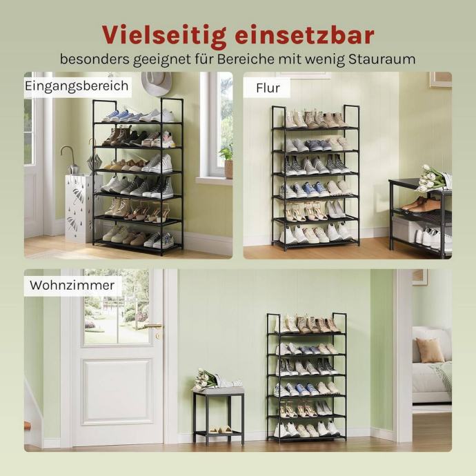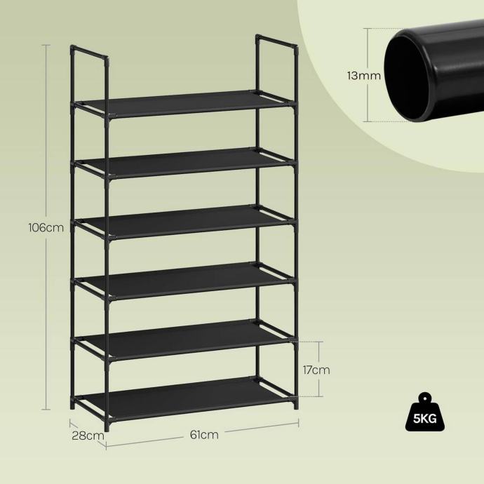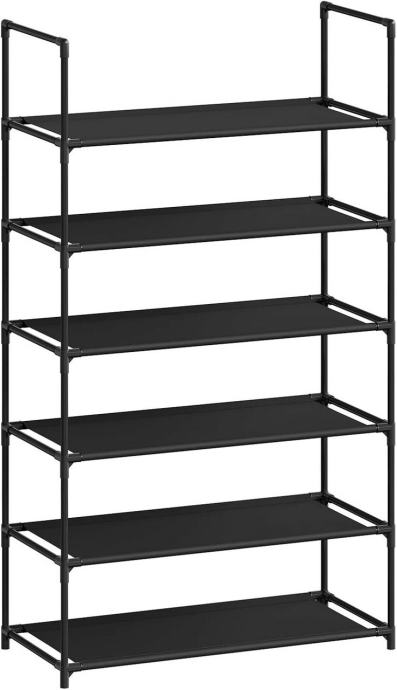 Ovaj stalak za cipele s 6 polica praktično je i štedljivo rješenje za organizaciju obuće u manjim prostorima. Uski i otvoreni dizajn dimenzija 61 x 28 x 106 cm omogućuje optimalno iskorištavanje vertikalnog prostora te smještaj do 18 pari cipela. Uklanjanjem jedne police moguće je pohraniti visoke čizme ili kutije za odlaganje, što ga čini iznimno fleksibilnim u svakodnevnoj upotrebi.