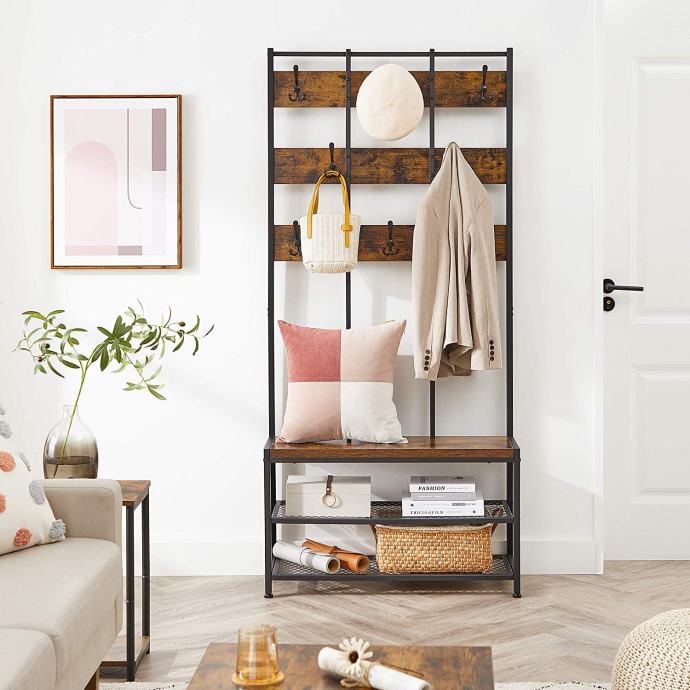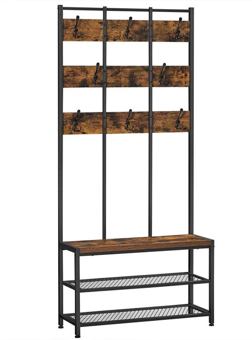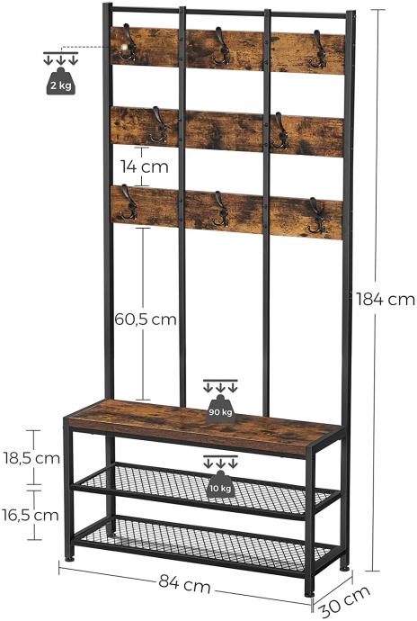 Okvir od crnog čelika i vintage akcenti ovog stalka za odjeću čine skladnu kombinaciju koja ovaj funkcionalni komad namještaja čini nečim posebnim. 8 kukica u 3 reda za vješanje kaputa, jakni i šalova kao i 1 klupa za obuvanje. Pogledajte dolje, postoje 2 mrežaste police za odlaganje vaših cipela. Stalak za kapute s više kukica i klupu za cipele. Priuštite si ovaj praktični komad namještaja i stvorite ugodno mjesto za sjedenje u hodniku. Za sve informacije nazovite na broj telefona 092/399-75-19