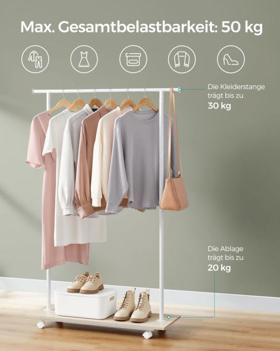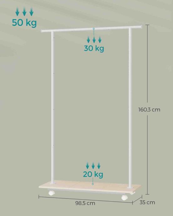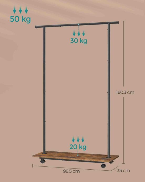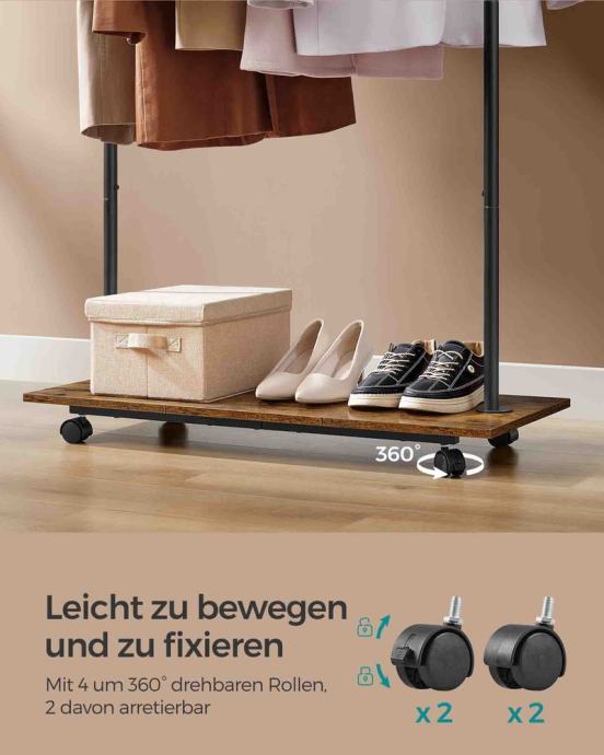 Šipka duga 98,5 cm ovog stalka za odjeću pruža vam dovoljno prostora za vješanje jakni, kaputa, hlača, torbi itd. Polica u donjem dijelu nudi prostor za odlaganje cipela i kutija. Čvrsta čelična vješalica za kapute može izdržati do 30 kg, dok polica od iverice može izdržati do 20 kg. Možete sigurno objesiti svoje zimske kapute i spremiti teške čizme. Detaljne upute, jasno označeni dijelovi i uključeni alati za montažu pomažu vam da sastavite ovaj stalak za kapute, tako da možete brzo uživati u optimalnoj udobnosti s ovim komadom namještaja. Ova šipka za odjeću ima 4 kotačića rotirajuća za 360°, od kojih 2 imaju kočnice tako da je možete lako premjestiti iz spavaće sobe u garderobu ili gdje god vam je potrebna. Zahvaljujući čistim linijama i elegantnoj kombinaciji vintage smeđe i tamnocrne, ova vješalica za kapute u industrijskom stilu pruža savršen izlog za vašu omiljenu odjeću dok dodaje karakter vašem domu. Za sve informacije nazovite na broj telefona 092/399-75-19