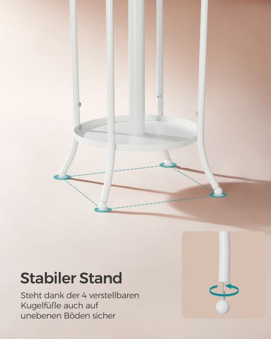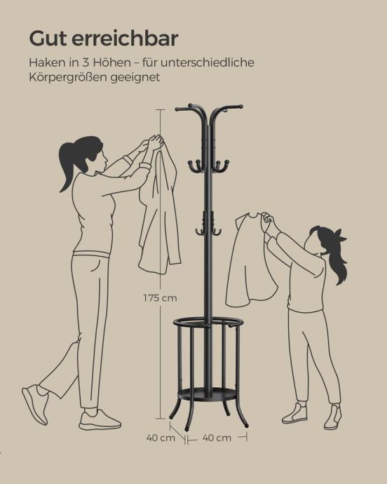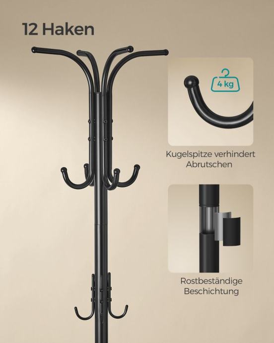 S 4 čvrste noge i niskim, stabilnim težištem, ovaj stalak za kapute vrlo je otporan. Čak i teški kaputi i torbe mogu se lako objesiti na 12 kuka (svaka kuka može držati do 4 kg). Ovaj samostojeći stalak za odjeću ima četiri kuglaste noge podesive po visini, koje pružaju dodatnu stabilnost i drže stalak stabilnim čak i na malo neravnim podovima. Stalak za kapute izrađen je od čvrstih metalnih cijevi s premazom protiv hrđe i posebno je izdržljiv. Savršeno se uklapa u hodnik, dnevni boravak ili spavaću sobu i dugotrajan je suputnik. Kukice s 12 kuglica štite vaše voljene kapute i jakne od oštećenja i sprječavaju da skliznu i završe na podu. Vješalica za kapute u hodniku opremljena je držačem za kišobrane koji je prikladan za velike i džepne kišobrane. Posuda za sakupljanje tekućine štiti pod od kišnice. Za sve informacije nazovite na broj telefona 092/399-75-19