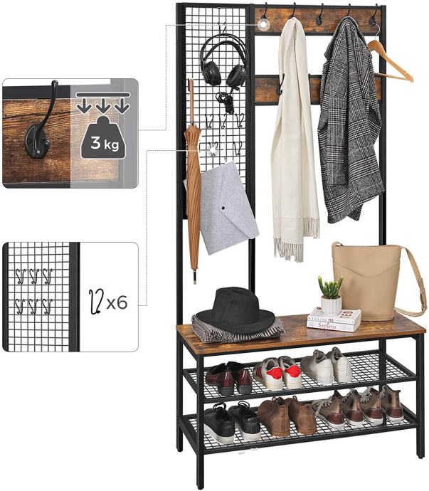 Veliki stalak za kapute sa klupom, vješalica za kapute s 9 kukica i stalak za cipele, stalak za kapute s rešetkastom stijenkom, 185 cm visine, puno prostora za odlaganje, hodnik, spavaća soba, vintage, tamno smeđa. Za sve informacije nazovite na broj telefona 092/399-75-19