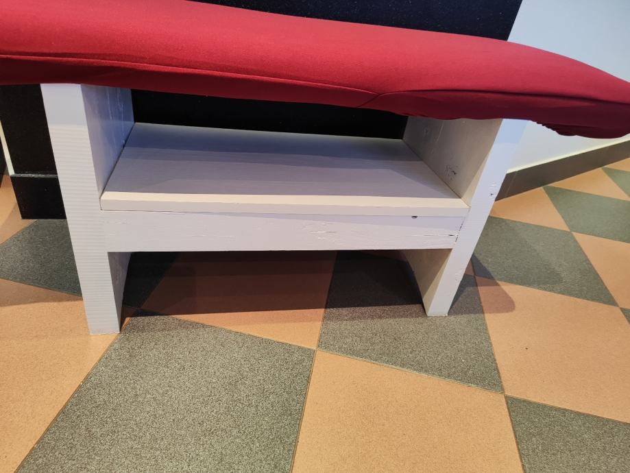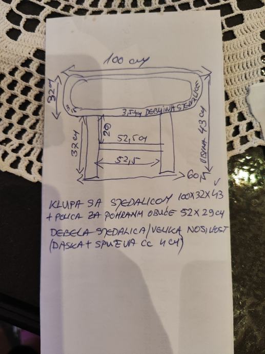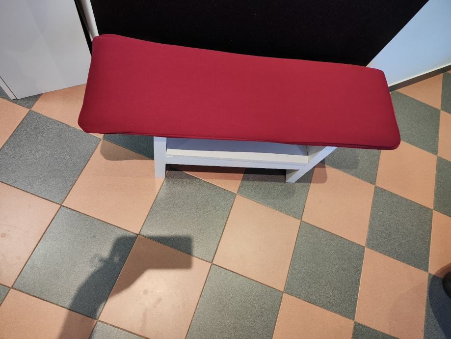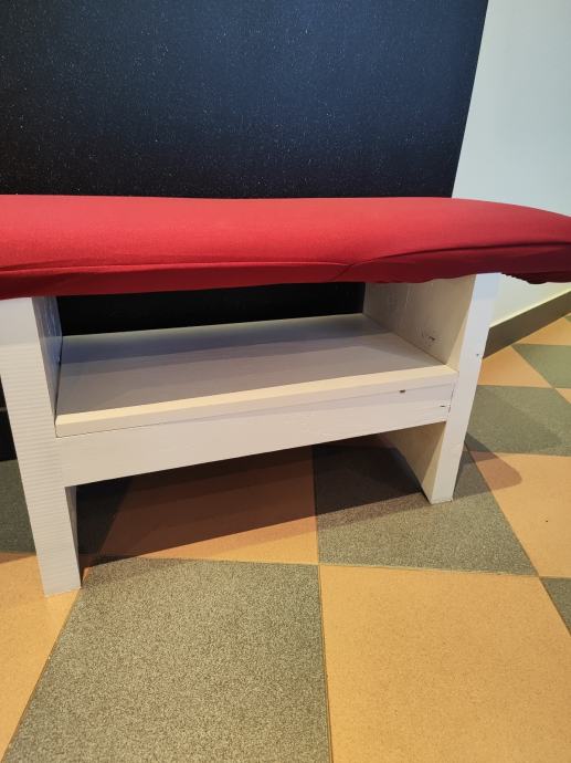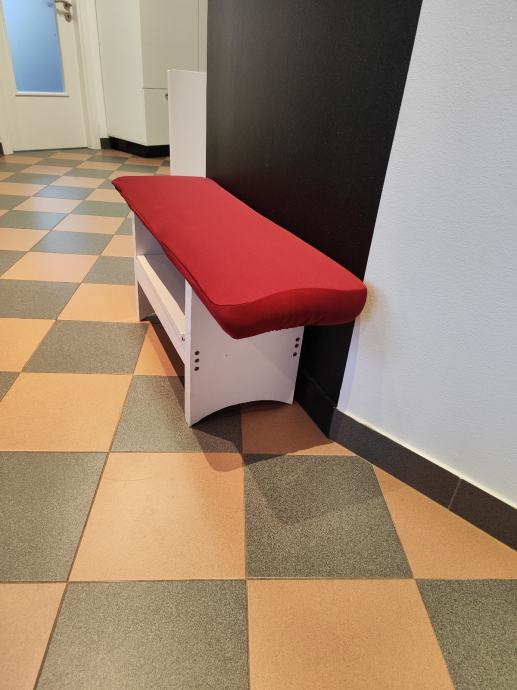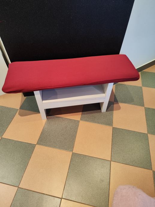 Prodajem jako čvrstu i udobnu klupicu sa sjedalicom i policom za odlaganje stvari ili obuće. Konstrukcija klupice je ručni rad,izrađena od drveta i pofarbana u bijelu boju. Sjedalica od debele daske, koja je obložena spužvom te je na sjedalicu/spužvu navučema rastezljiva navlaka, koja se skida i pere ,te mijenja po želji. Praktična je hodnik, verandu,podrum, vrt... za ljude koji trebaju sjesti da se obuju .
