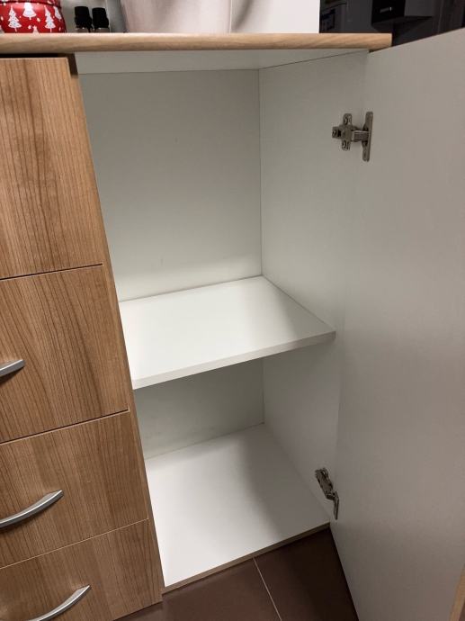 Ima dva bočna ormarića s jednom policom i četiri ladice u sredini.