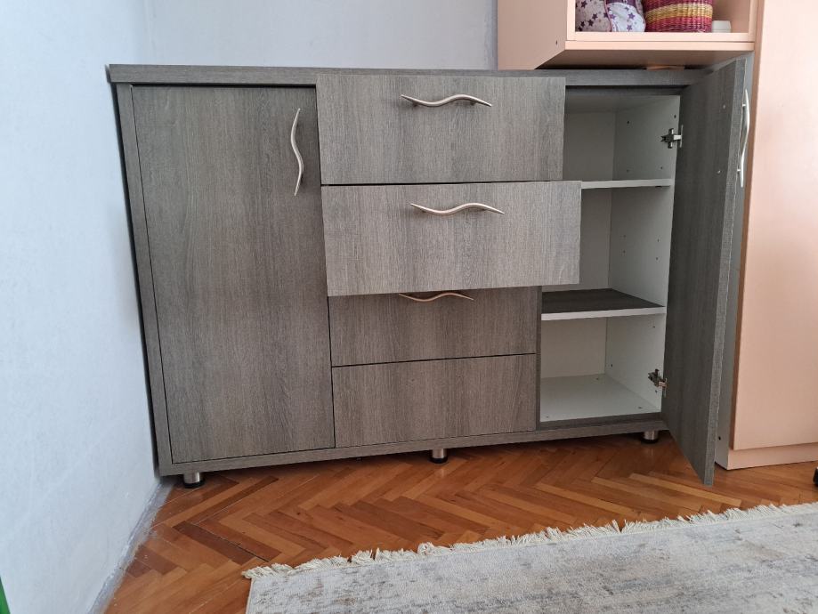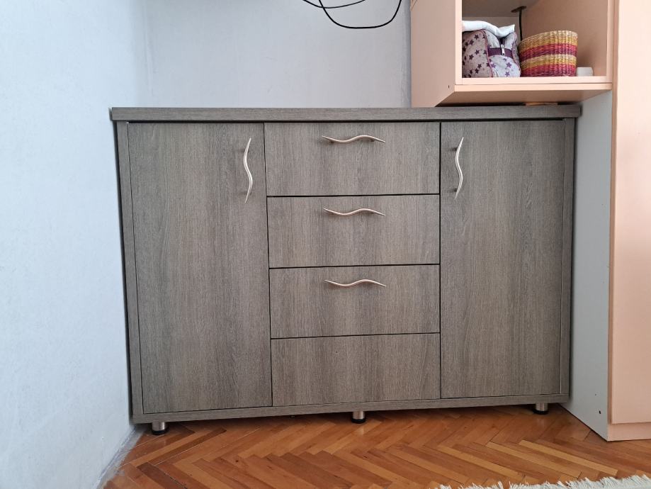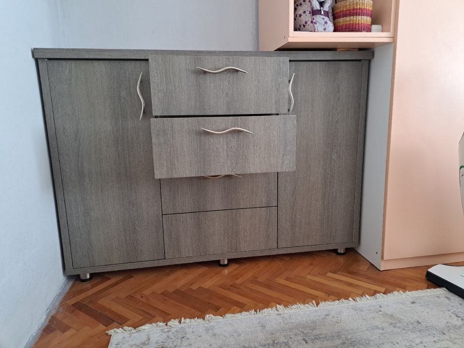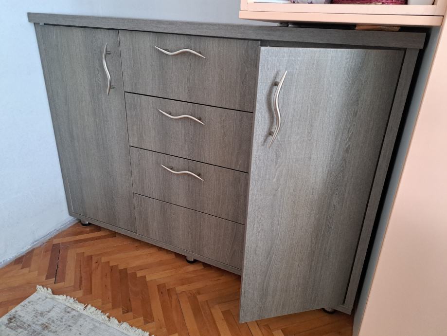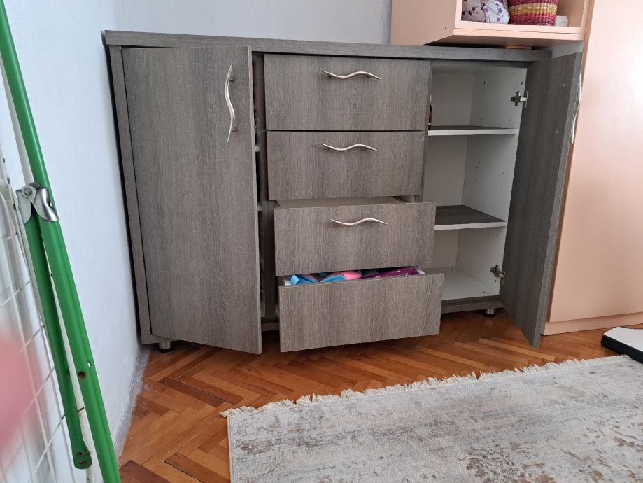 Sastoji se od zasebnih elemenata 2 ormarića i 4 ladice.(vrlo čvrsta)Prodaje se radi preuredjenja prostora.
