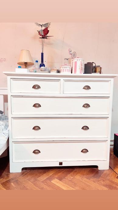 Bijela drvena komoda s 3 velike ladice i 2 manje, dimenzija 113 cm x 60 cm x 110 cm, ocuvana, u jako dobrom stanju, gotovo nekoristena, s manjim ostecenjima na dijelovim gdje je popucala boja