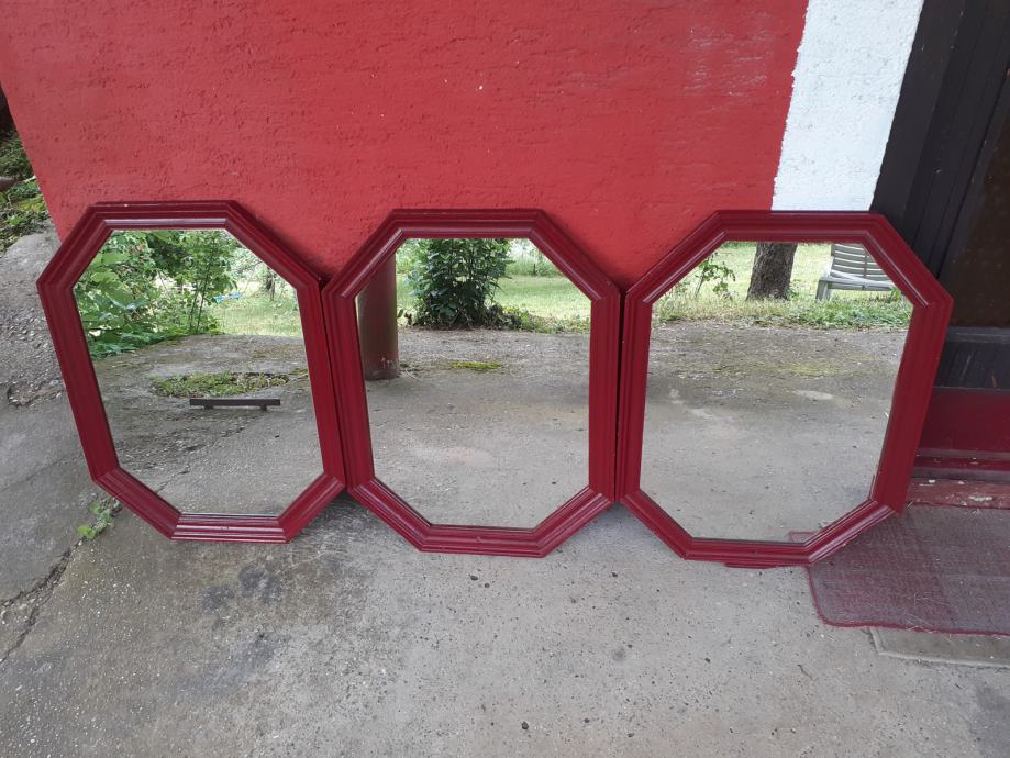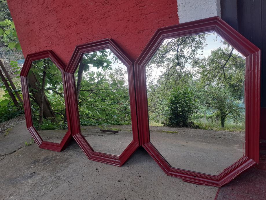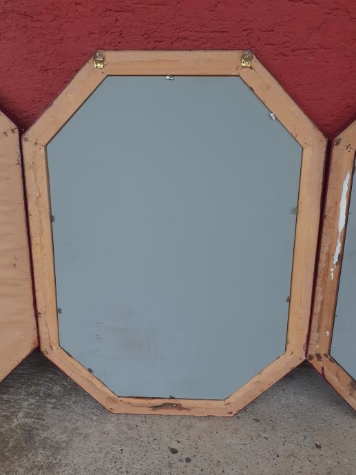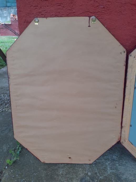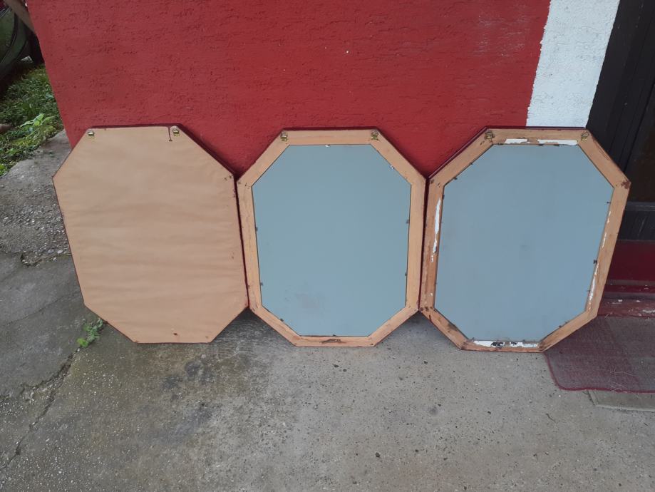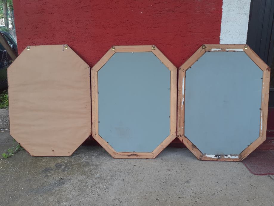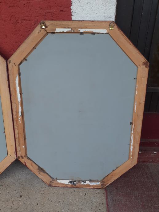 Prodajem tri ogledala uokvirena u osmerokutne drvene okvire. Dimenzije samih ogledala su 71 cm x 51 cm, dok su dimenzije ogledala sa okvirom 80 cm x 60 cm, a debljina drvenog okvira je 3,5 cm. Ogledala su osmerokutnog oblika, pa pružaju više mogućnosti za slaganje (nama su bila u hodniku postavljena horizontalno i dijagonalno). Ogledala, kao i okviri, su u vrlo dobrom stanju, uz naravno vidljive tragove korištenja, dok samo jedan okvir ima manja oštećenja na donjem dijelu (jasno vidljiva na slikama). Dva ogledala bi sa zadnje strane trebalo nanovo kartonirat i zaštiti (bilo je u lošijem stanju, pa sam skinuo), dok je treće u odličnom stanju i ne zahtjeva daljnja ulaganja. Prodajem isključivo sva tri u kompletu, dakle ne prodajem pojedinačno. Svako ogledalo je slikano posebno i iz više kuteva kako bi se vidjelo stvarno stanje. Isključivo osobno preuzimanje. Imam još namještaja u istom stilu, oglasi broj 44337407, 44337450, 44337588, 44337624, 44337706, 44337753, popust na količinu.