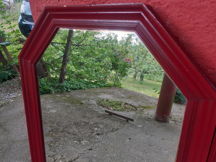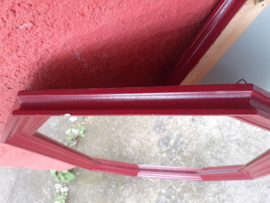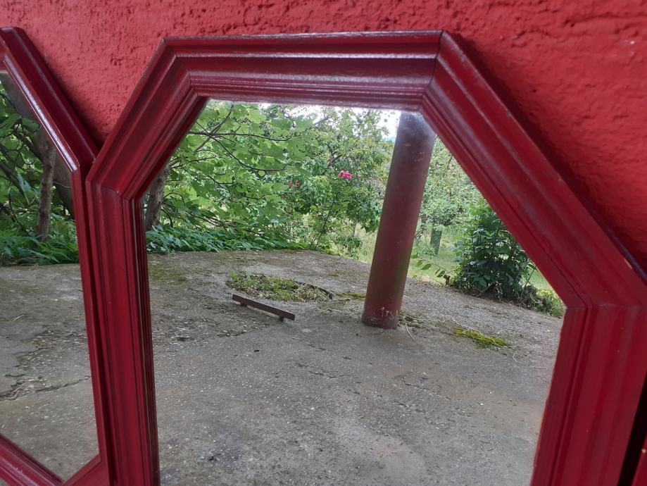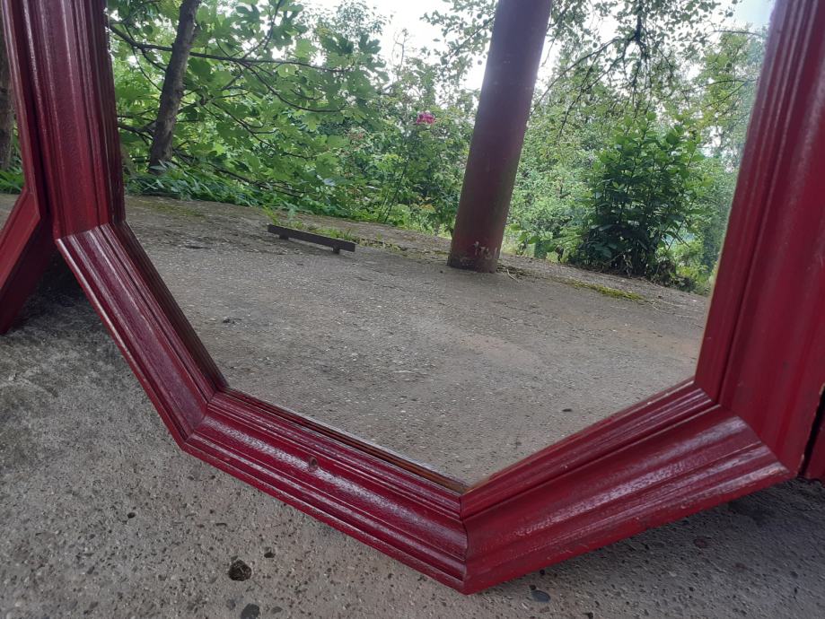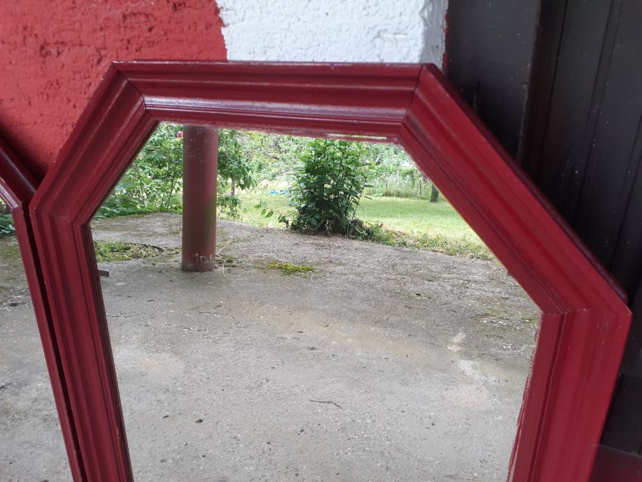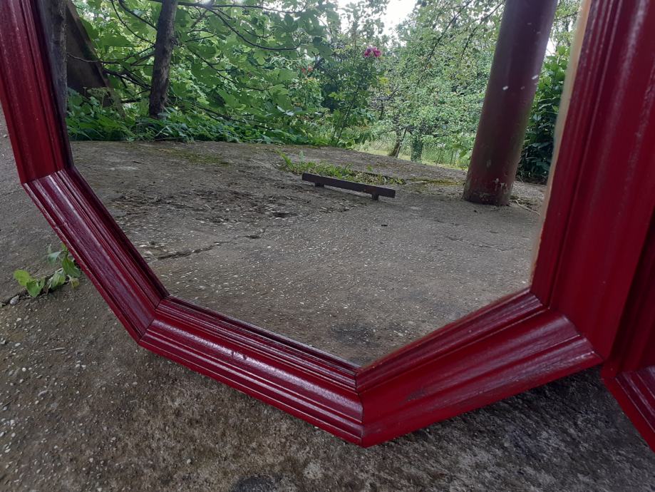 Prodajem tri ogledala uokvirena u osmerokutne drvene okvire. Dimenzije samih ogledala su 71 cm x 51 cm, dok su dimenzije ogledala sa okvirom 80 cm x 60 cm, a debljina drvenog okvira je 3,5 cm. Ogledala su osmerokutnog oblika, pa pružaju više mogućnosti za slaganje (nama su bila u hodniku postavljena horizontalno i dijagonalno). Ogledala, kao i okviri, su u vrlo dobrom stanju, uz naravno vidljive tragove korištenja, dok samo jedan okvir ima manja oštećenja na donjem dijelu (jasno vidljiva na slikama). Dva ogledala bi sa zadnje strane trebalo nanovo kartonirat i zaštiti (bilo je u lošijem stanju, pa sam skinuo), dok je treće u odličnom stanju i ne zahtjeva daljnja ulaganja. Prodajem isključivo sva tri u kompletu, dakle ne prodajem pojedinačno. Svako ogledalo je slikano posebno i iz više kuteva kako bi se vidjelo stvarno stanje. Isključivo osobno preuzimanje. Imam još namještaja u istom stilu, oglasi broj 44337407, 44337450, 44337588, 44337624, 44337706, 44337753, popust na količinu.