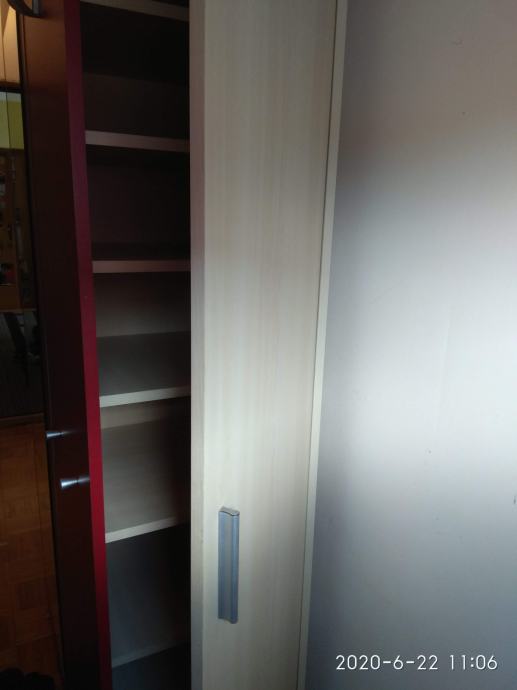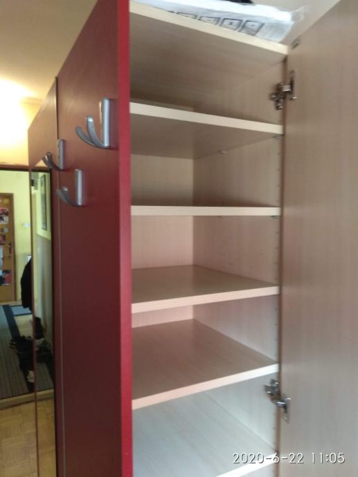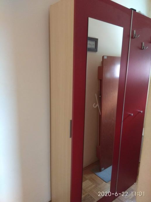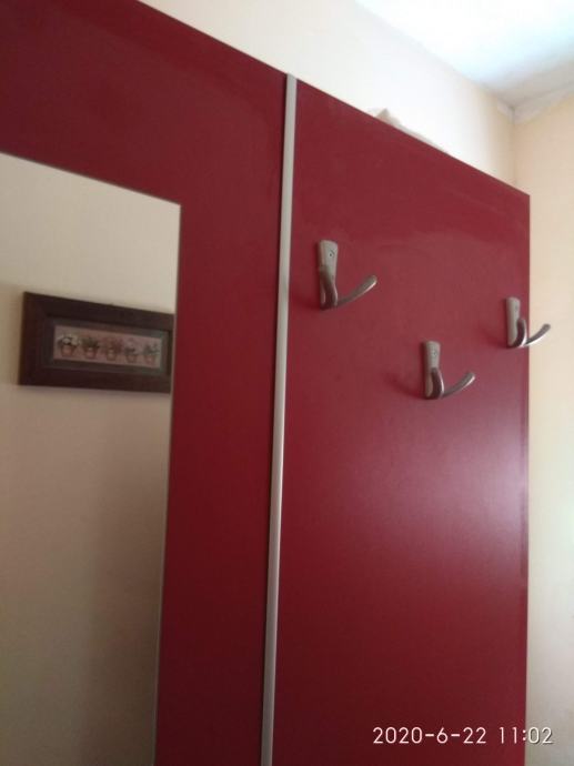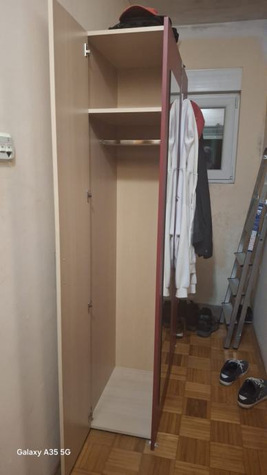 Prodajem ormar za predsoblje, s odjeljkom za cipele, i odjeljkom koji ima šipku za vješalice za kapute i policu. Vrata su bočno, a prednja strana ima ogledalo i dodatne 3 vješalice. Dimenzije: Visina - 195 cm, širina: 110 cm, dubina: 39 cm. Ormar je u odličnom stanju.