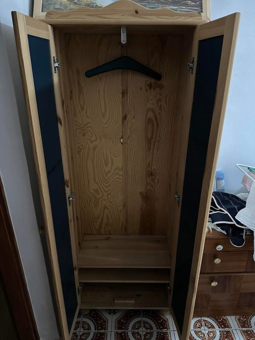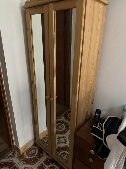 Prodajem drveni ormar prirodne boje, sa duplim vratima i ogledalima. Unutrašnjost sadrži šipku za kačenje garderobe, kao i dodatne police u donjem djelu za odlaganje obuće ili drugih stvari. Vrata se zatvaraju čvrsto i funkcionalno, a ogledala su u dobrom stanju bez oštećenja.