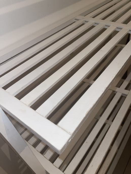 Veliki kosi policar za cvijece. Koristeno dosta i vide se tragovi koristenja. Potrebno je prebojati i popraviti neke police. Cijena je prilagodena manama. Potrebno preuzeti na Spinutu.