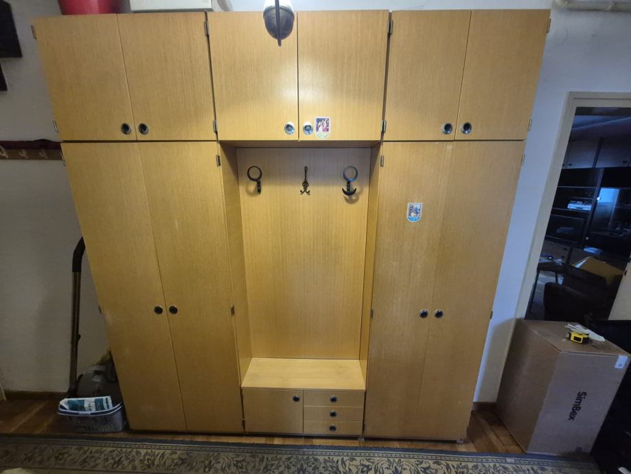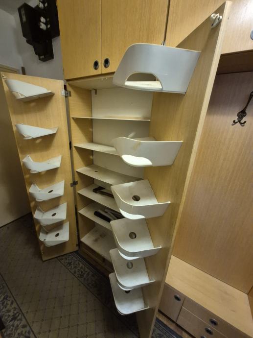 Ormar za hodnik 217x230x27,5 s puno.prostora za različite sadržaje. Sastoji se od više elemenata: visoki ormar za cipele, visoki ormar za garderobu, središnji dio s vješalicama.