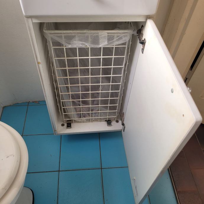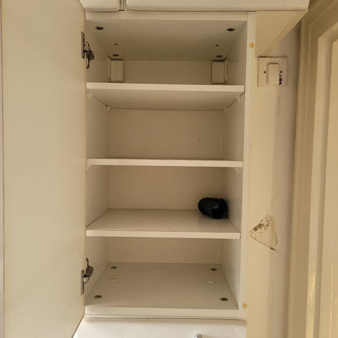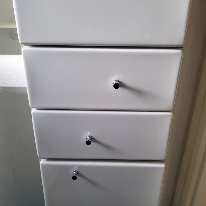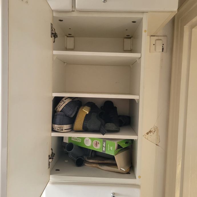 Kombinacija seta bijelih ormara. Dva ormara su korištena za cipele, jedan ormar je korišten za spremanje usisavača, dva ladičara su korištena za kozmetiku i zadnji ormar ima mrežnu udlagu u kojoj se skupljao zmazani veš.