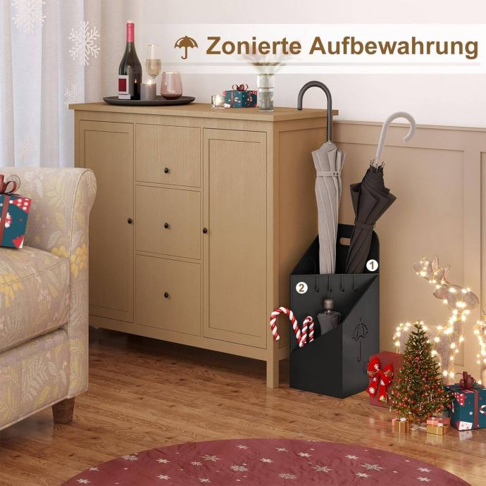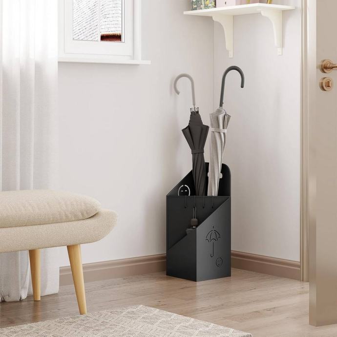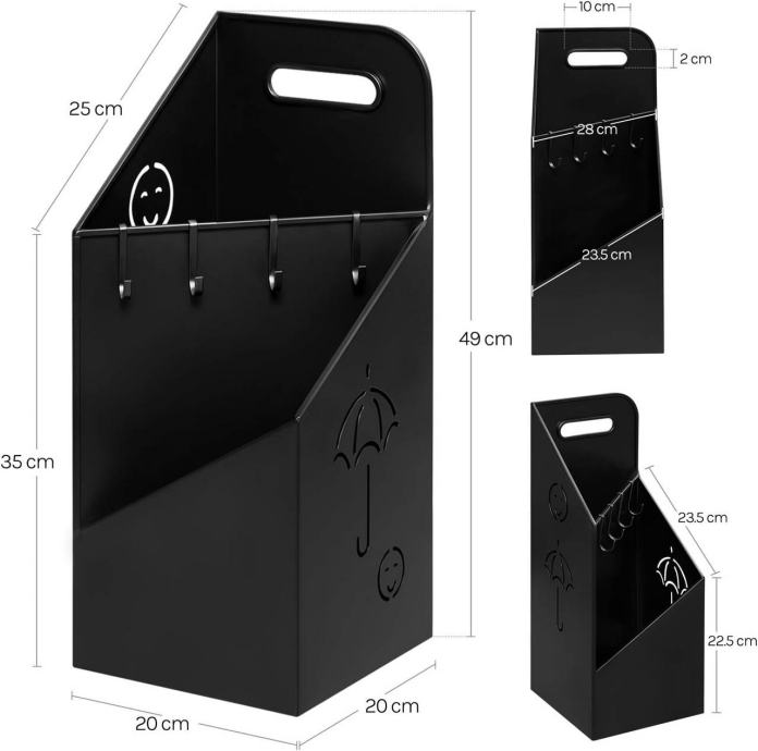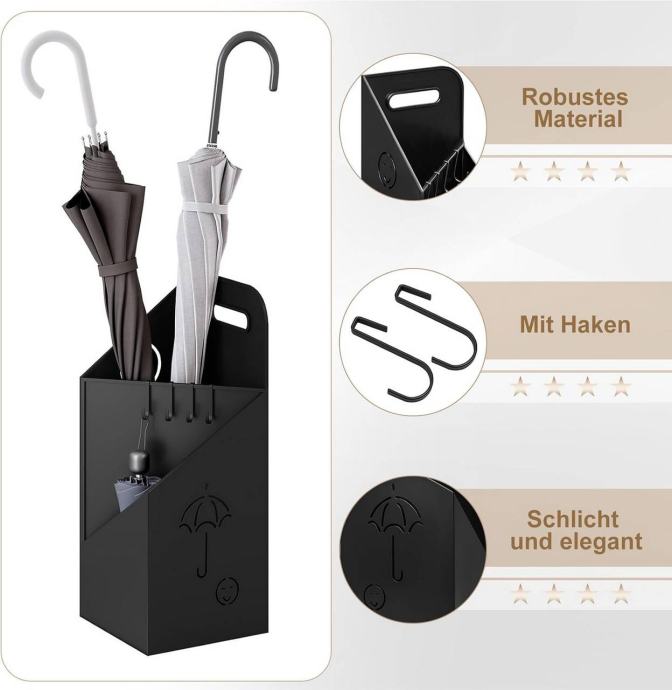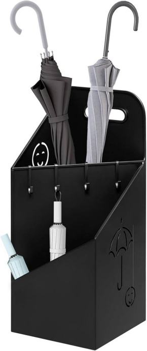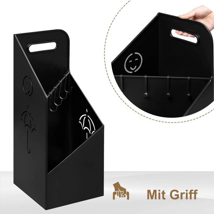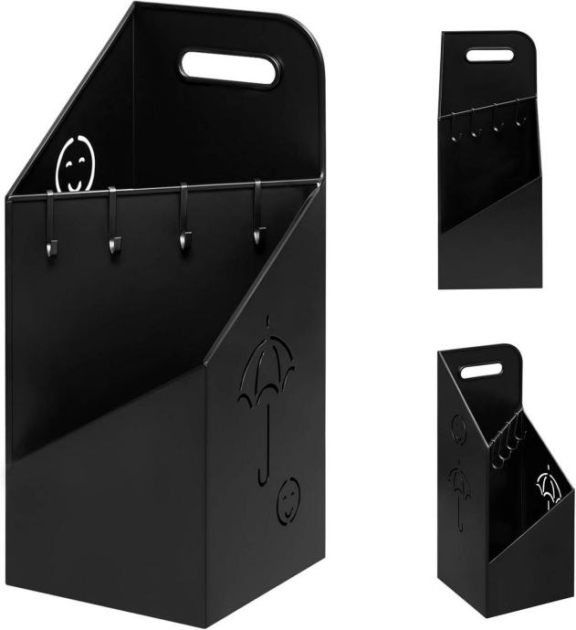 Opremljen je ručkom za lakše premještanje i ojačanim kukama. Kuke se osim za kišobrane mogu koristiti i za odlaganje manjih predmeta koji se lako izgube, poput ključeva, povodca za kućnog ljubimca ili novčanika.