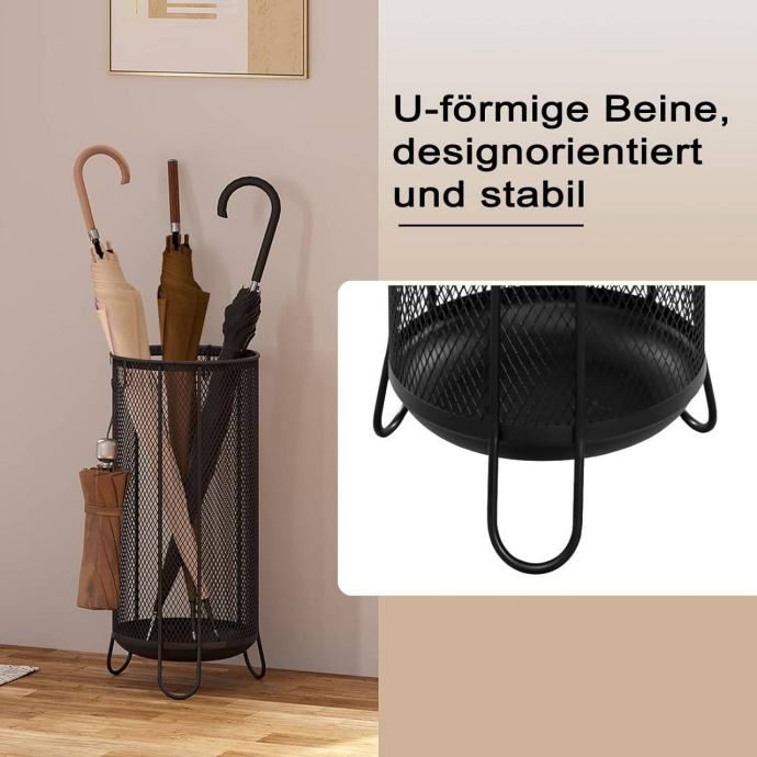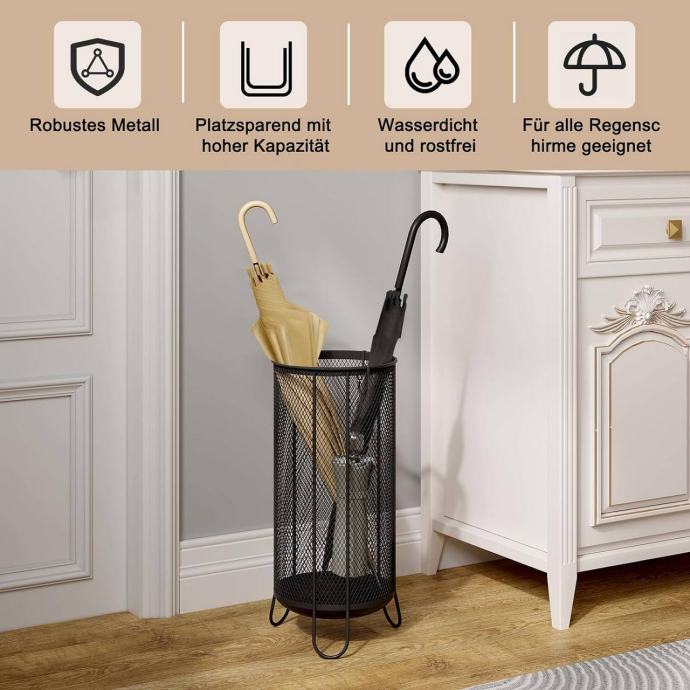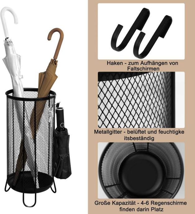 Ovaj stalak za kišobrane s visinom od 49 cm i promjerom od 23 cm omogućuje pohranu 4 do 6 kišobrana. Četiri vanjske kuke omogućuju vješanje sklopivih kišobrana kako bi se izbjeglo nakupljanje na podu i olakšao pristup.