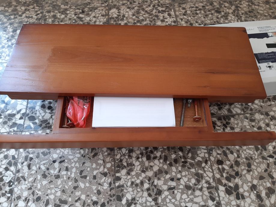 Prodajem novu zidnu policu od borovine sa malom ladicom i nevidljivim sustavom ugradnje , te priborom za montažu.