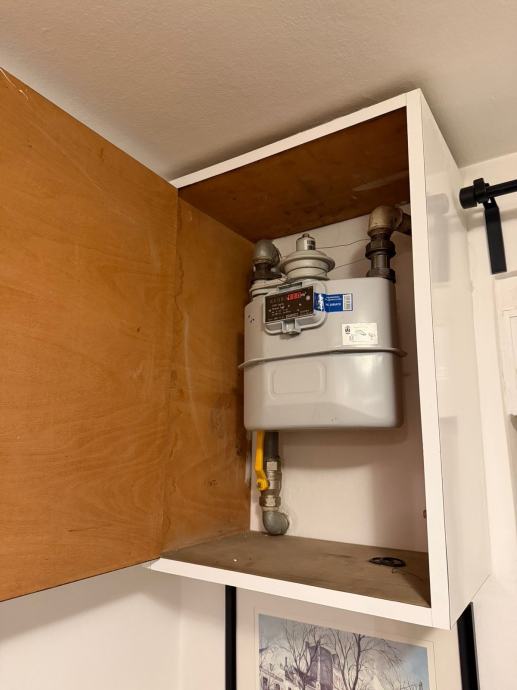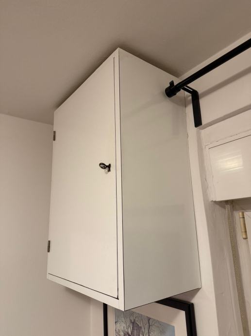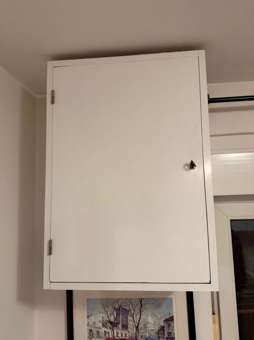 Zidni ormaric u bijeloj boji visoki sjaj koji se moze objesiti na zid, dubina 30, sirina 51 i visina 72. Idealan za svaku prostoriju, moze sluziti za skrivanje plinomjera kao na slici