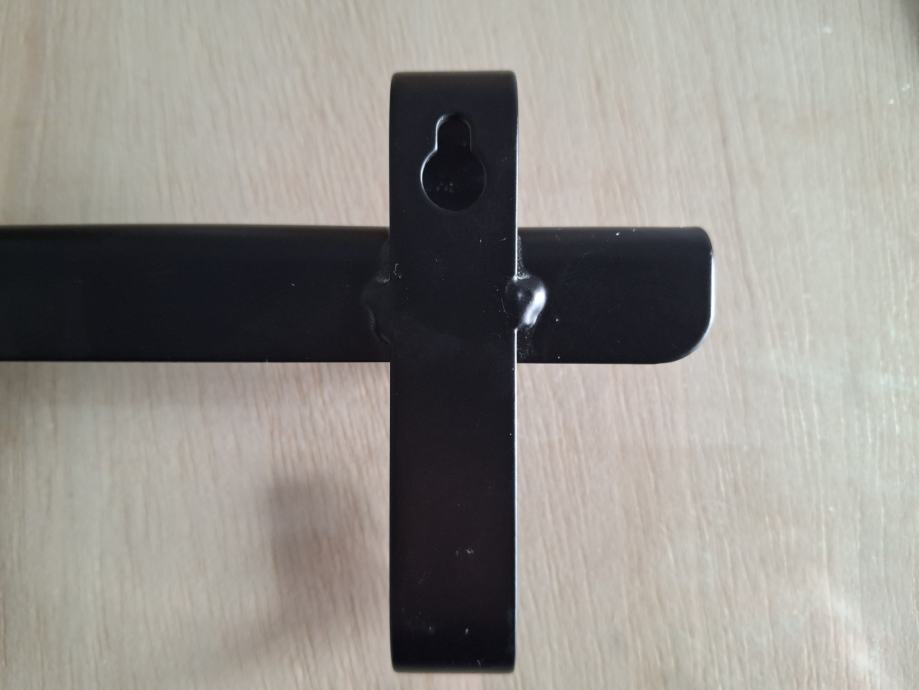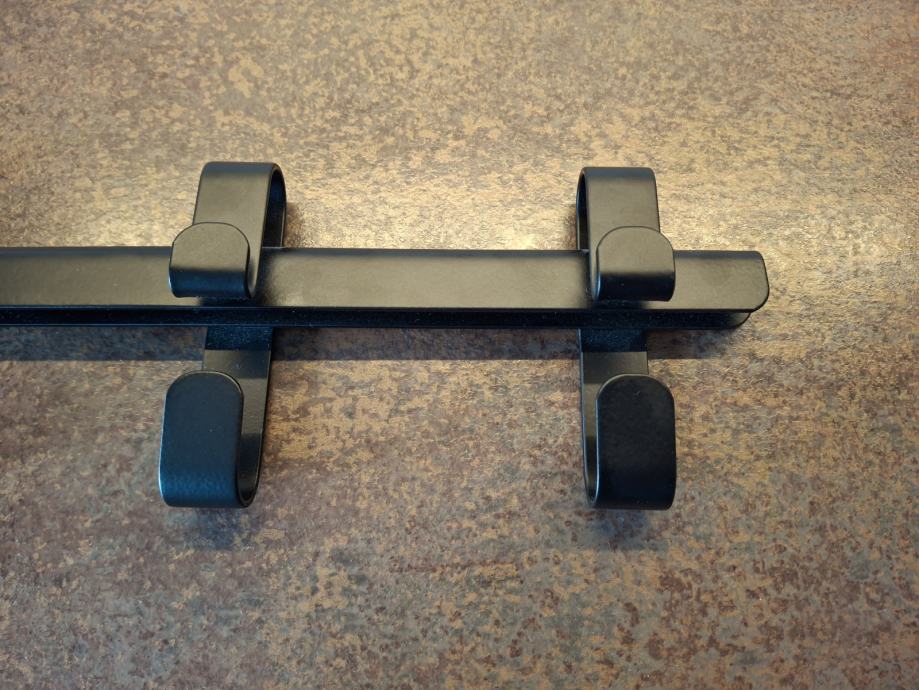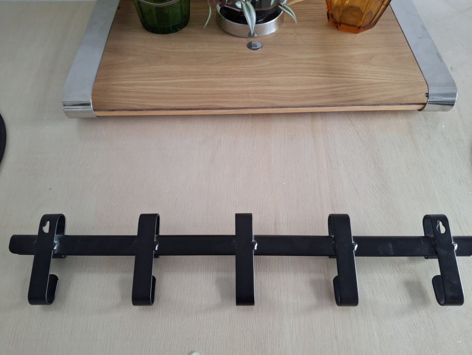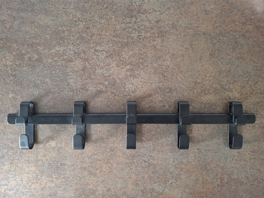Crna vješalica za odjeću s 10 kukica za na zid, nikad montirana, galvanizirani čelik, modernistički minimalistički dizajn, dimenzije 50x10x3 cm.