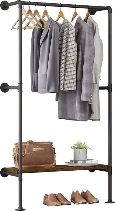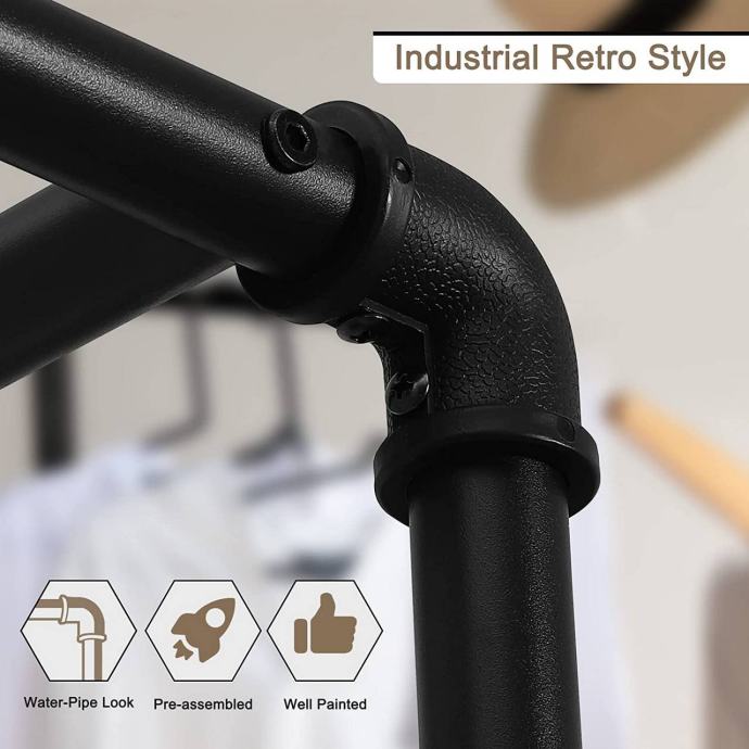 Ova zidna vješalica za odjeću u industrijskom stilu kombinira crne metalne cijevi i MDF policu u dekoru tamnog drveta, stvarajući vintage izgled koji se savršeno uklapa u spavaću sobu, hodnik, garderobu ili moderni interijer.