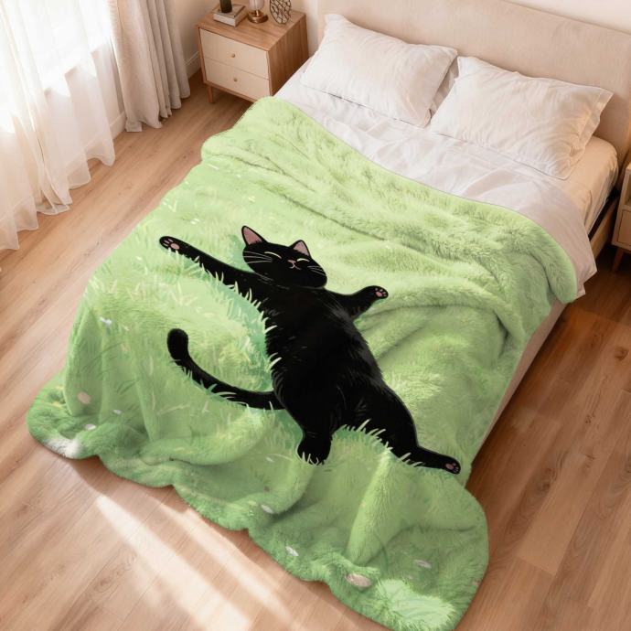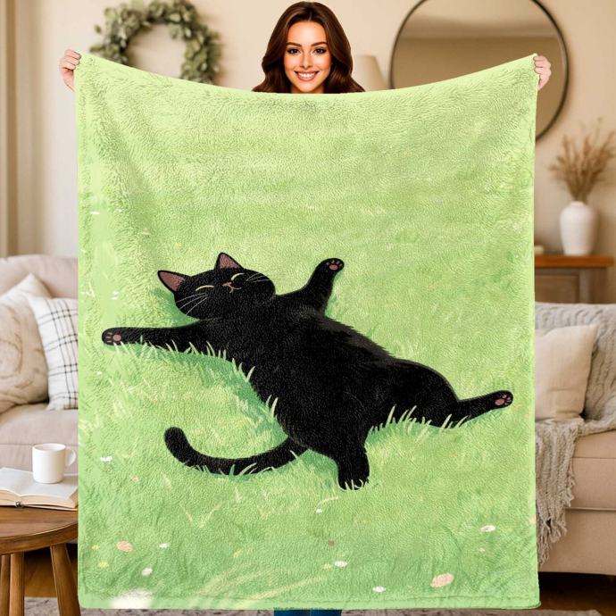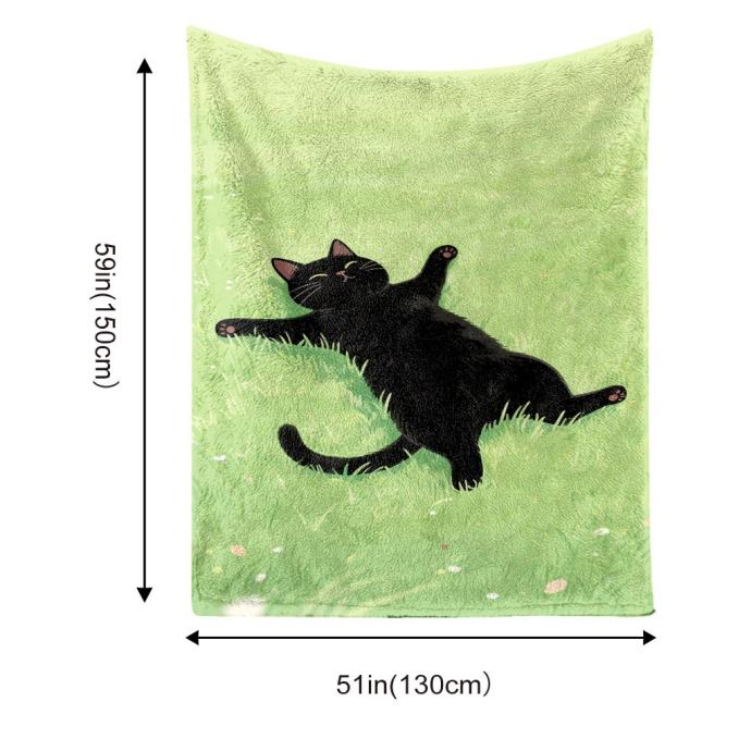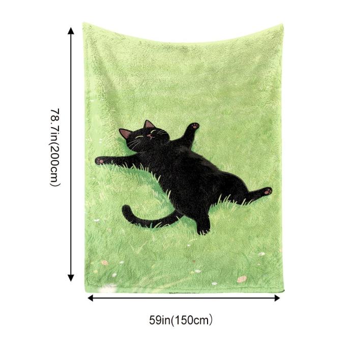 1-dijelni flanelski pokrivač s printom crne mačke i plišanog mačjeg uzorka u limeta zelenoj boji - Mekani udobni prekrivač za krevet, sofu, kampiranje za sva godišnja doba - Poklon za ljubitelje mačaka, Može se prati u perilici rublja, Više veličina (crna/zelena) - Prekrivač za krevet.