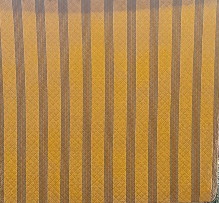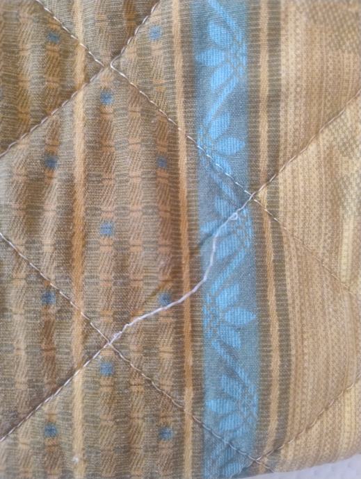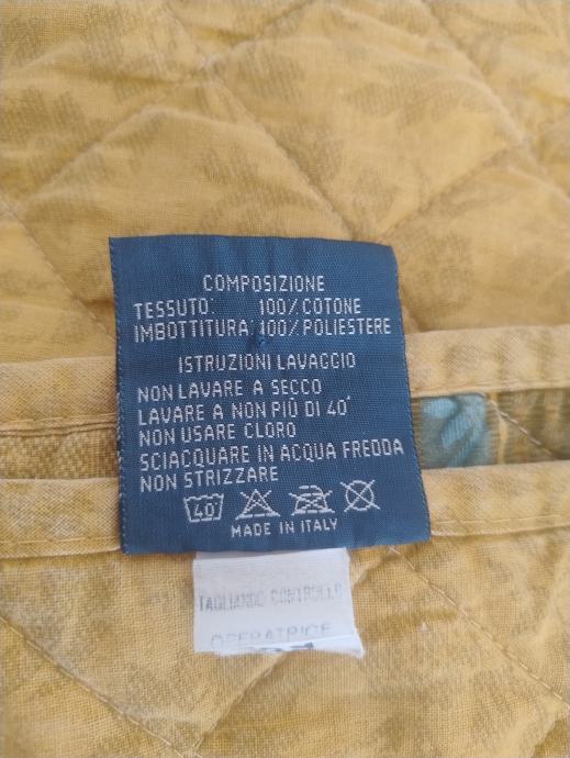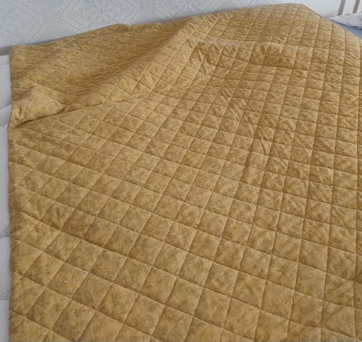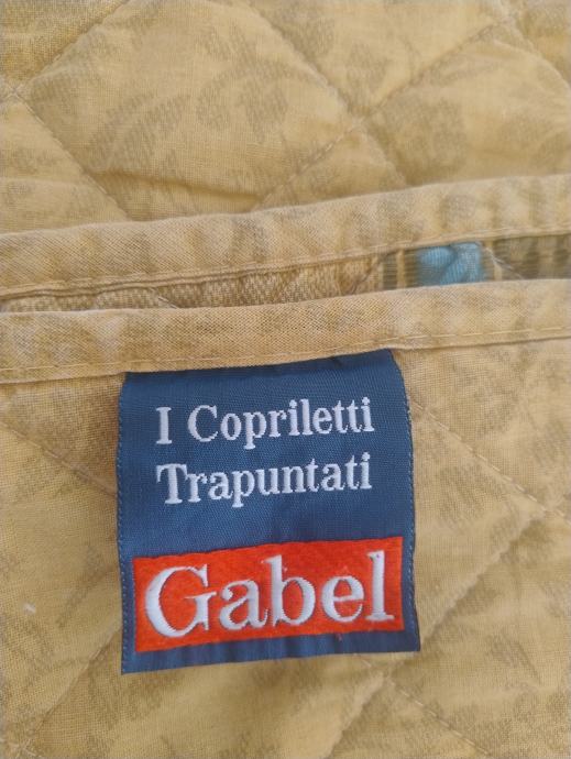 Gabel ljetni pokrivač. Oker žuta sa tirkiznim detaljima, druga strana jednobojna sa cvjetnim brokatom. Pamučna navlaka, poliester ispuna. U dobrom stanju, čist. 240x260cm