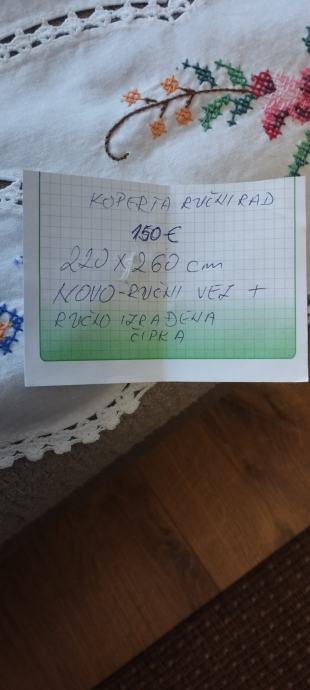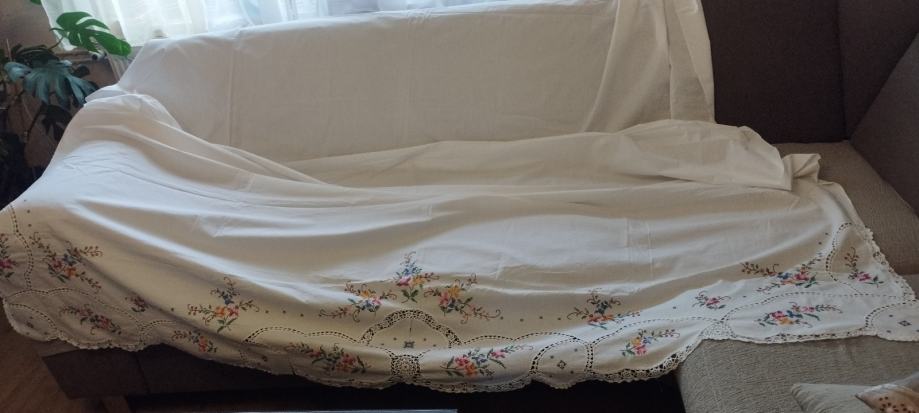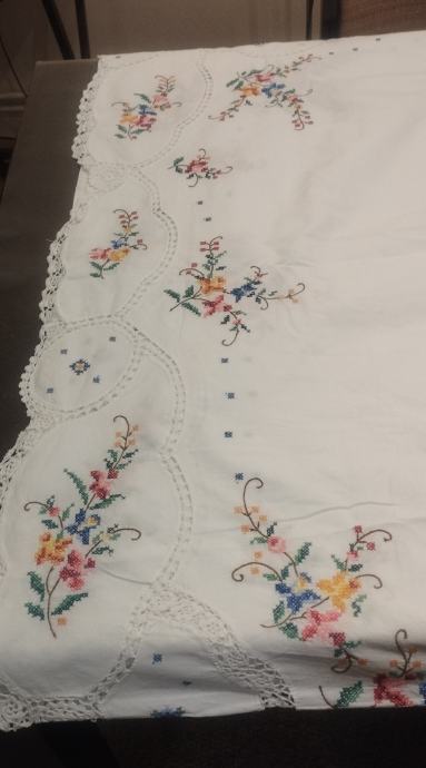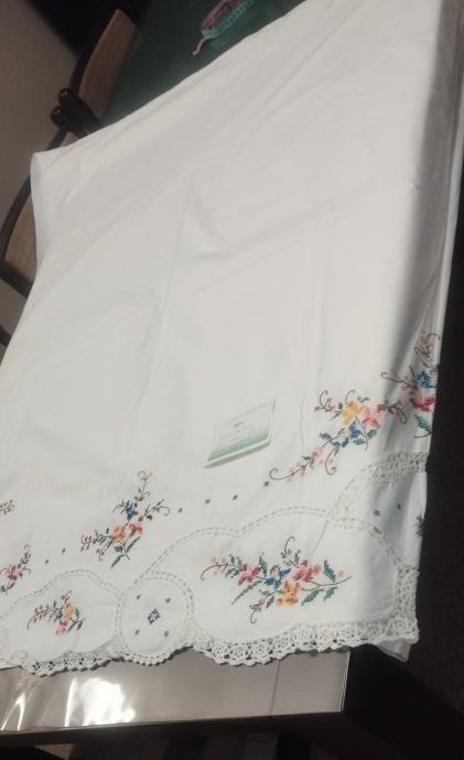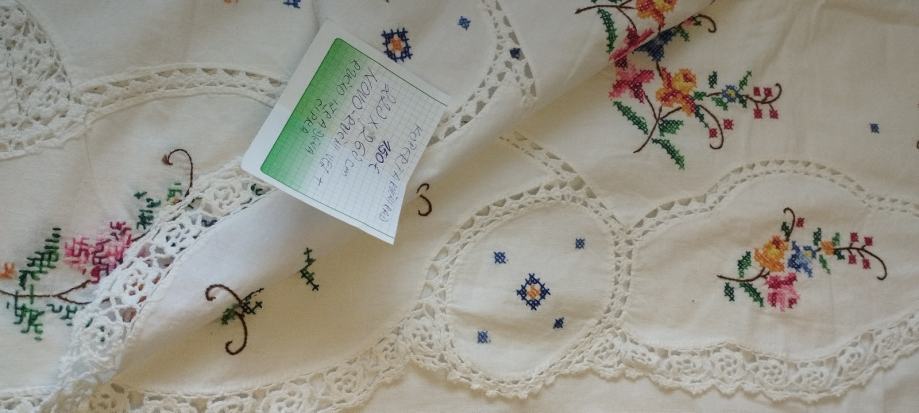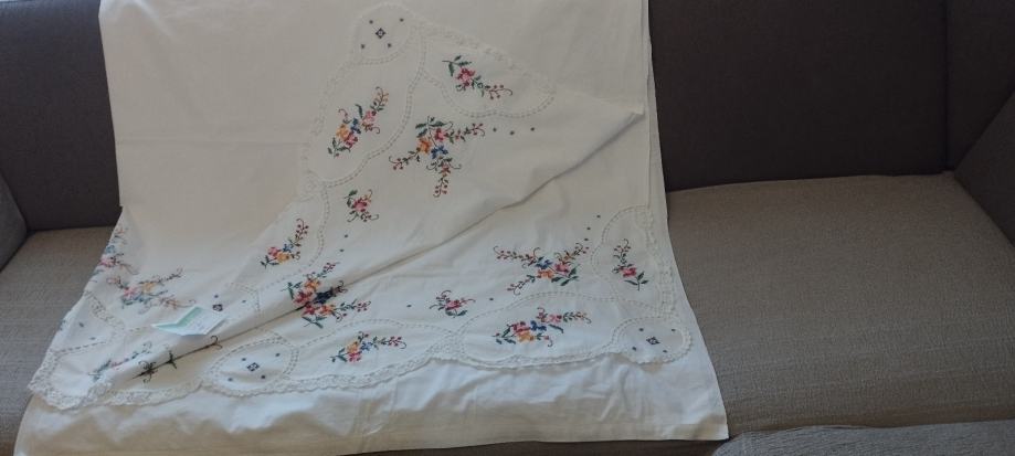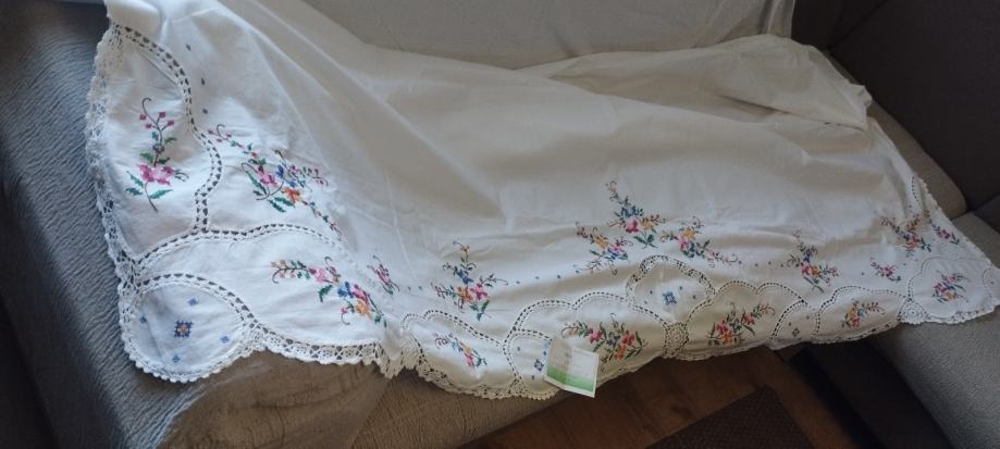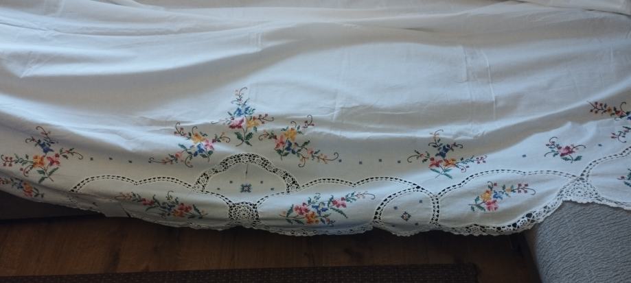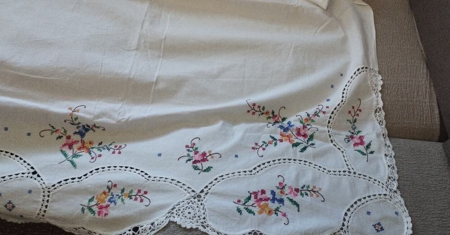 Ručni vez na bjelom kvalitetnom platnu, plus ručno heklana čipka.