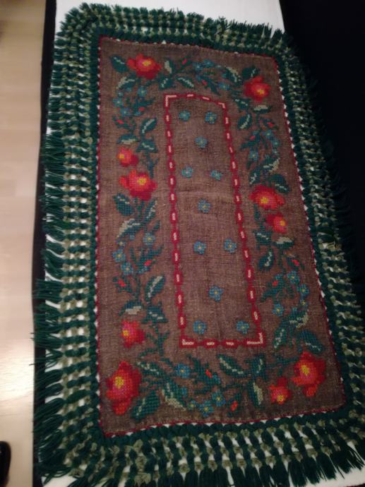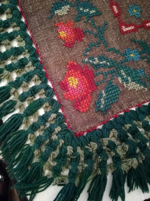 Prodajem starinski tkani i vunom vezeni prekrivač. Dimenzije 121 (+28 rese) sa 75 (+28 rese).