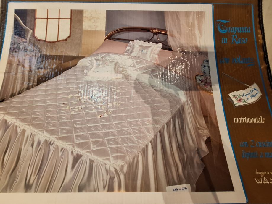 Prodajem komplet talijanski prekrivač s 2 ukrasna jastuka. Svijetloplave boje u uskrasom na sredini. Sve je u originalnom pakiranju, s time da je prekrivač zapakiran u foliju i time odlično očuvan. Namijenjen za bračni krevet, dimenzija 240x270cm.