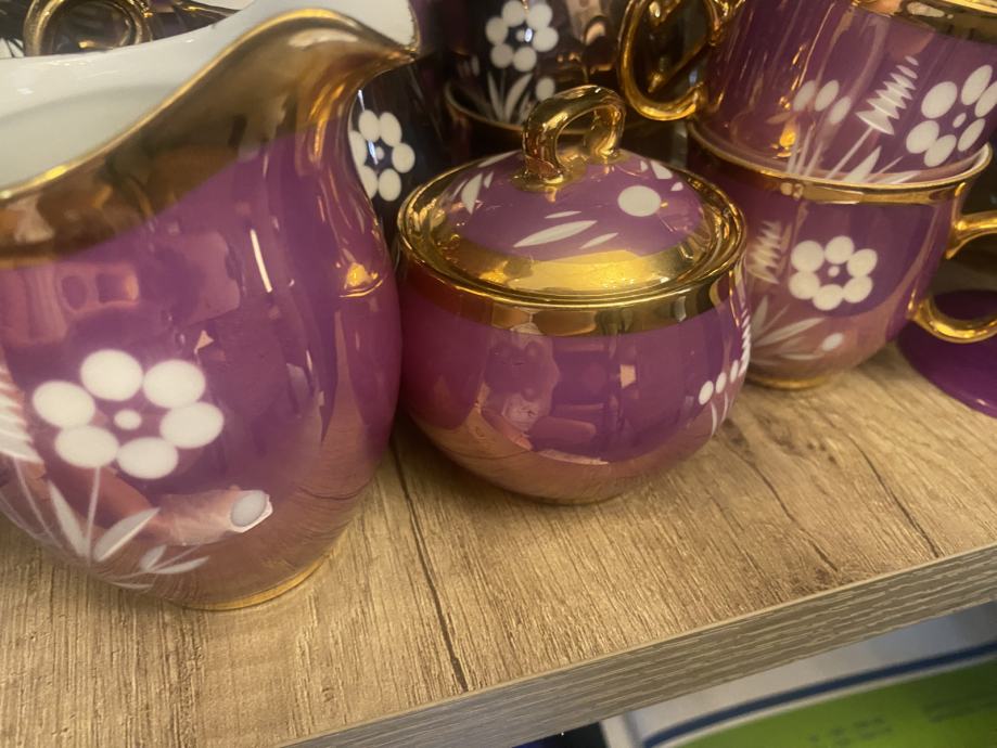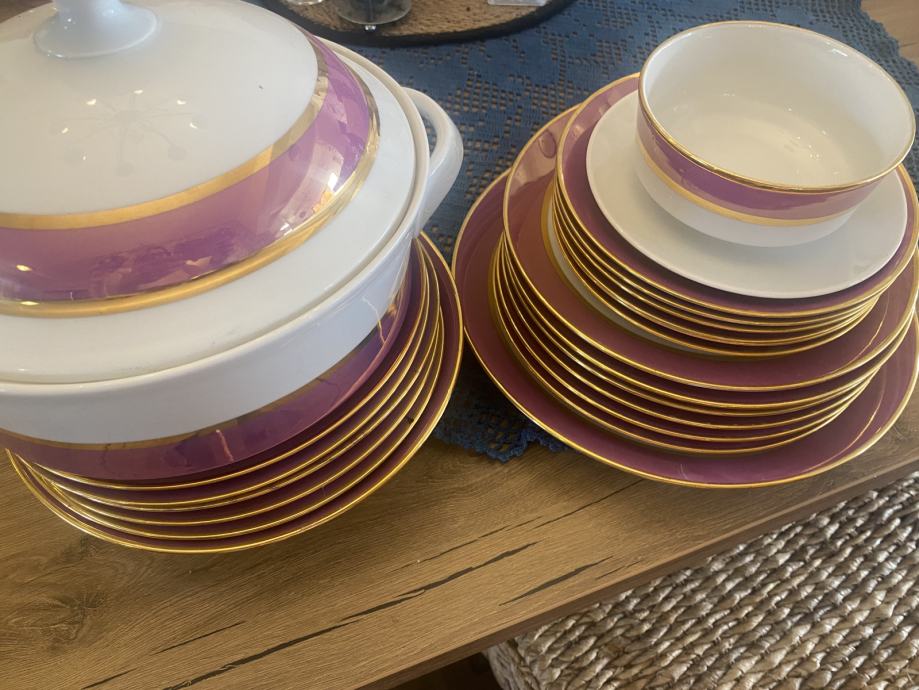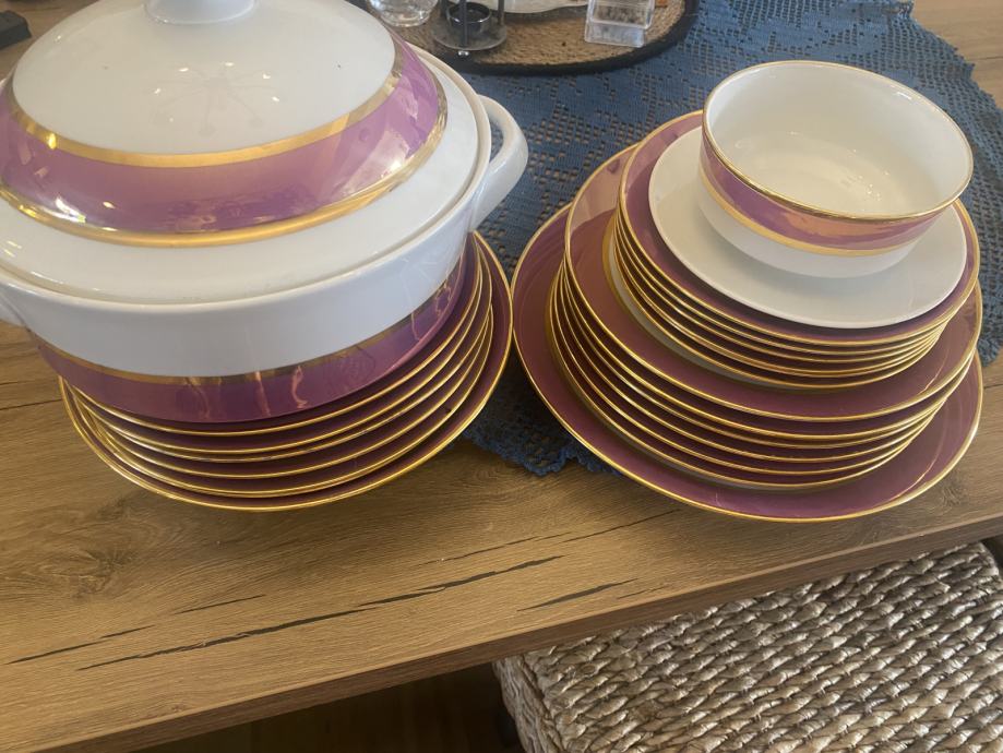 Izuzetno lijep porculanski servis s pozlatom uščuvan za 6 osoba i kompletom šalica za kavu, dozirkom za šećer i mlijeko te vrčem. Ručni rad roze boje.Fali samo Jedan tanjur stradao u transportu.Zdjela za juhu te dvije za salate.