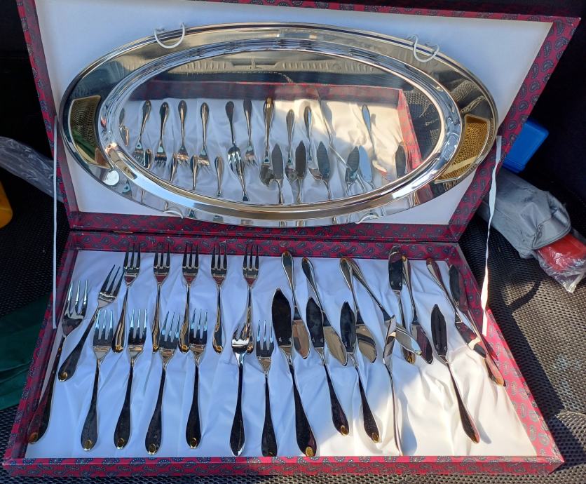 Prodajem pribor za jelo za ribu, za 12 osoba, vilica i nož za serviranje s 24-karatnim zlatnim vrhom na drškama i pripadajući ovalni pladanj za serviranje.