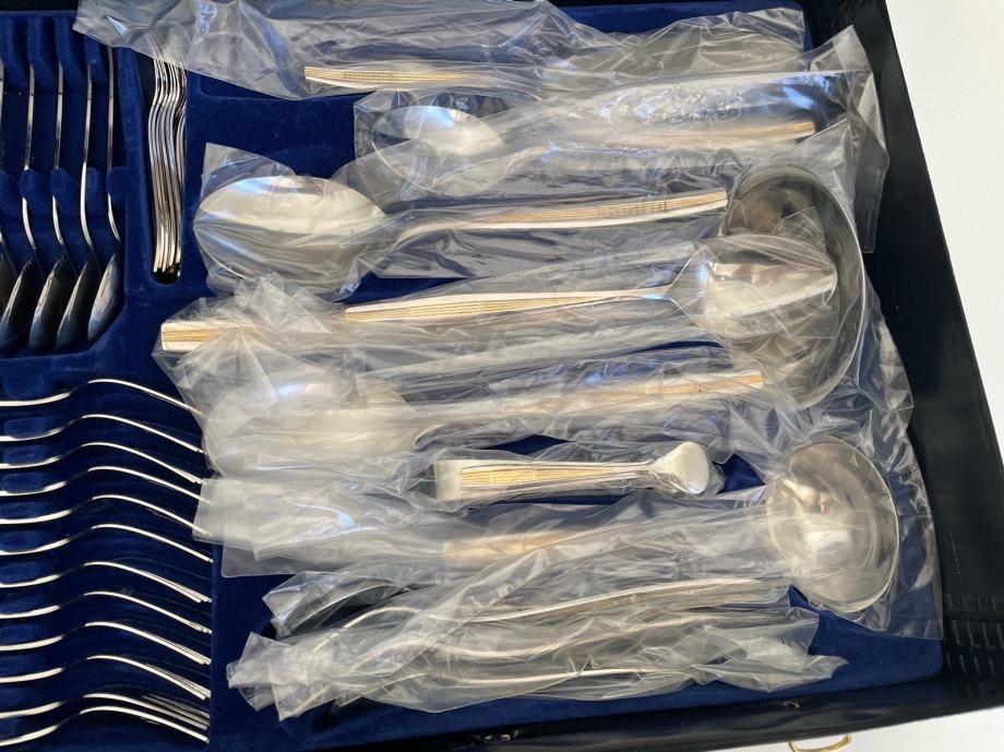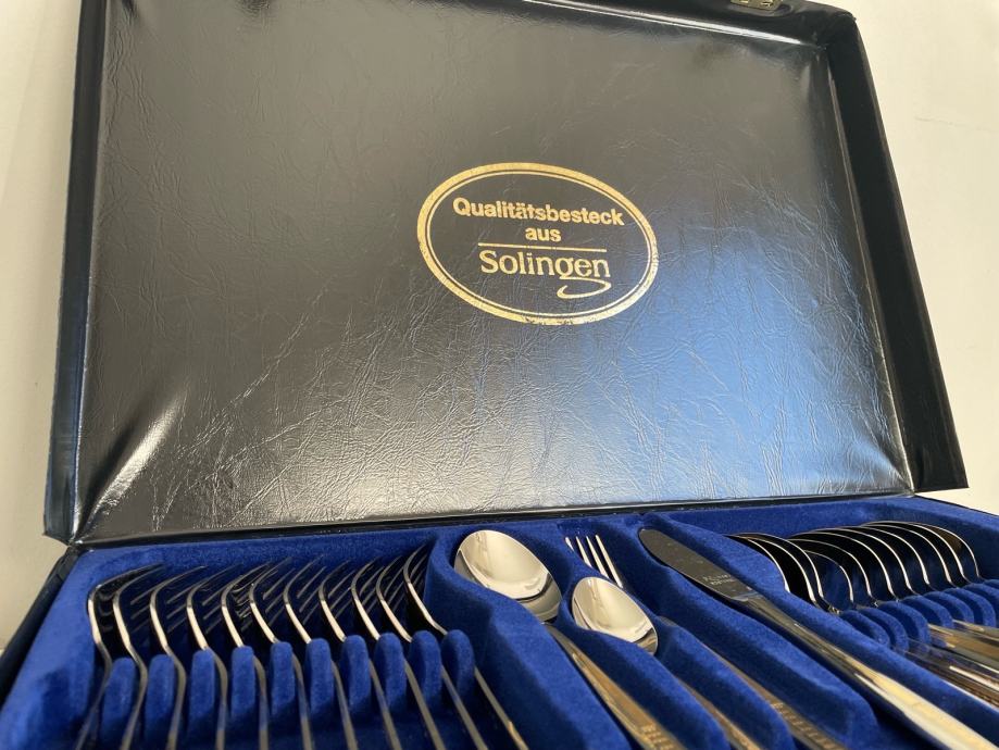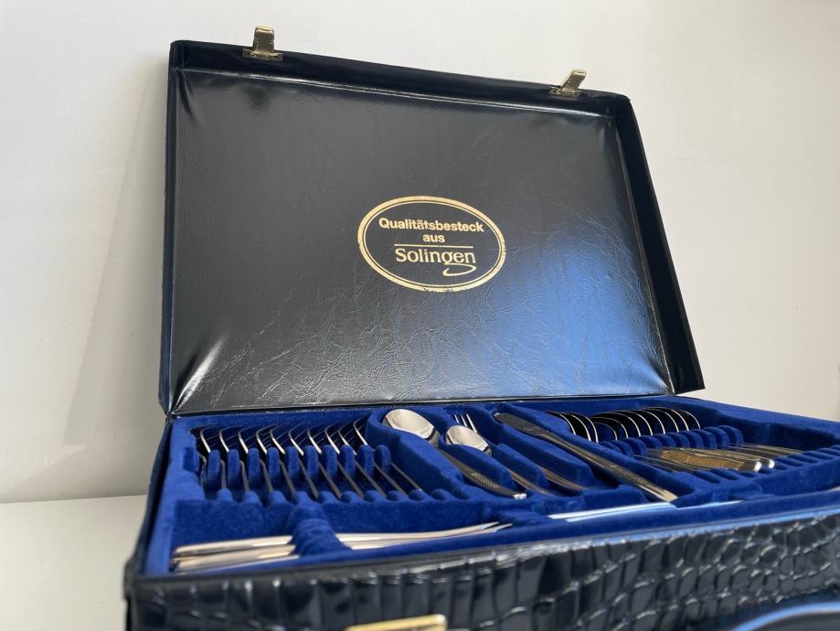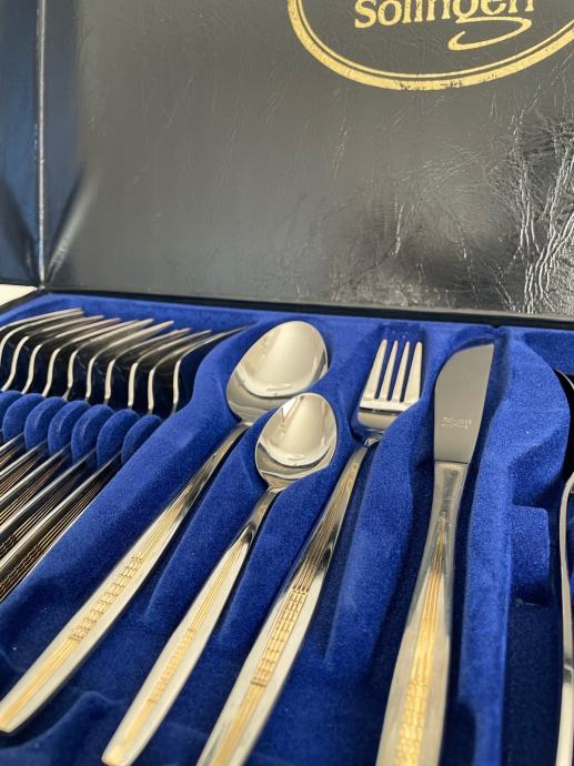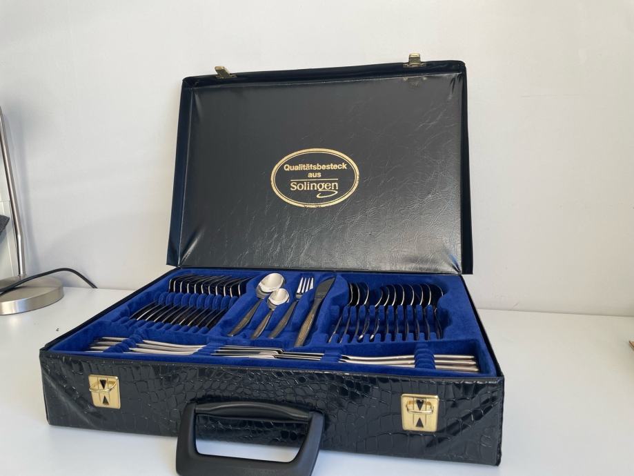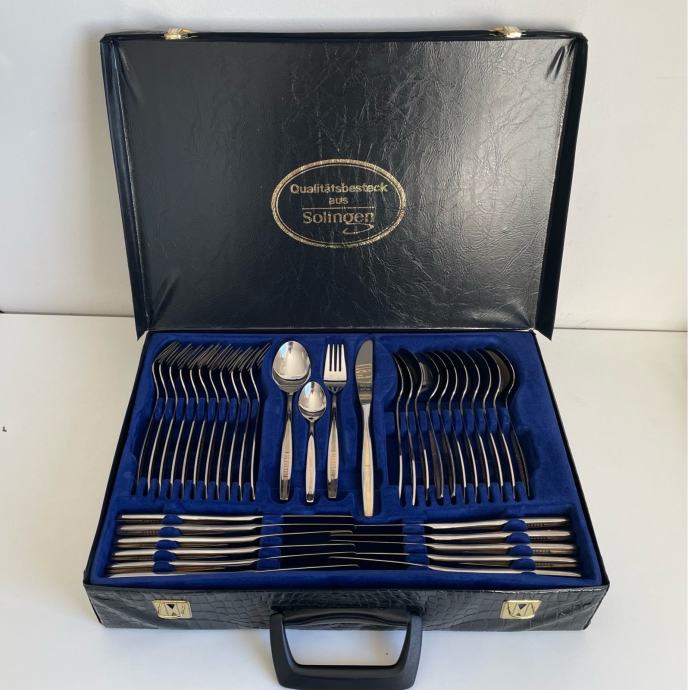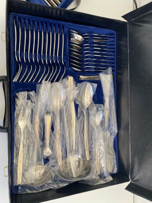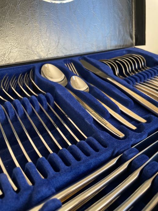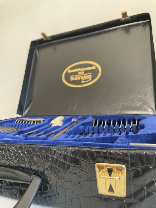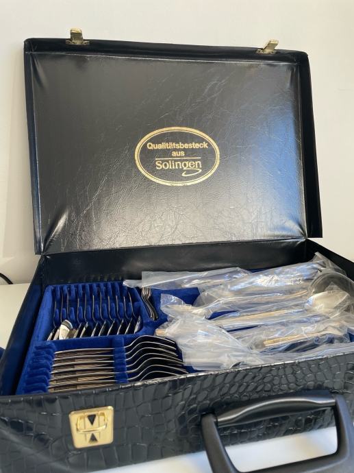 Prodajem novi set pribora za jelo Solingen (Qualitätsbesteck aus Solingen). Radi se o kompletnom setu koji uključuje žlice, vilice i noževe od nehrđajućeg čelika. Sve je posloženo u elegantnoj tvrdog kovčegu s plavom baršunastom podlogom koja štiti svaki komad. Za 12 osoba.