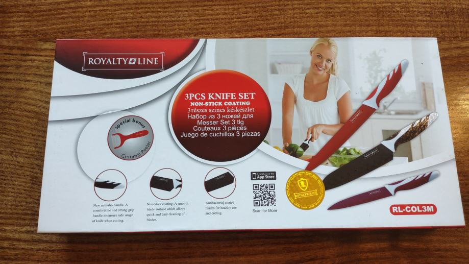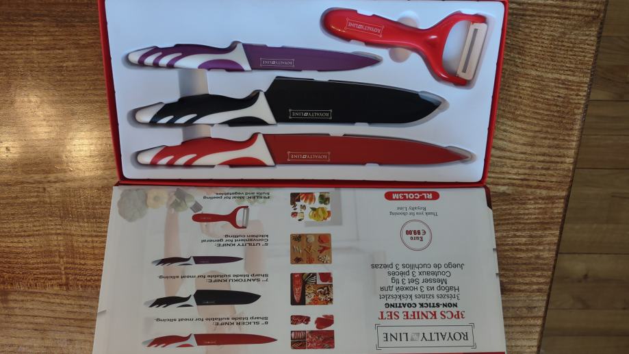 Set kuhinjskih noževa: slicer nož, santoku nož, utility nož i guljač za krumpire. Novo, nikad korišteno