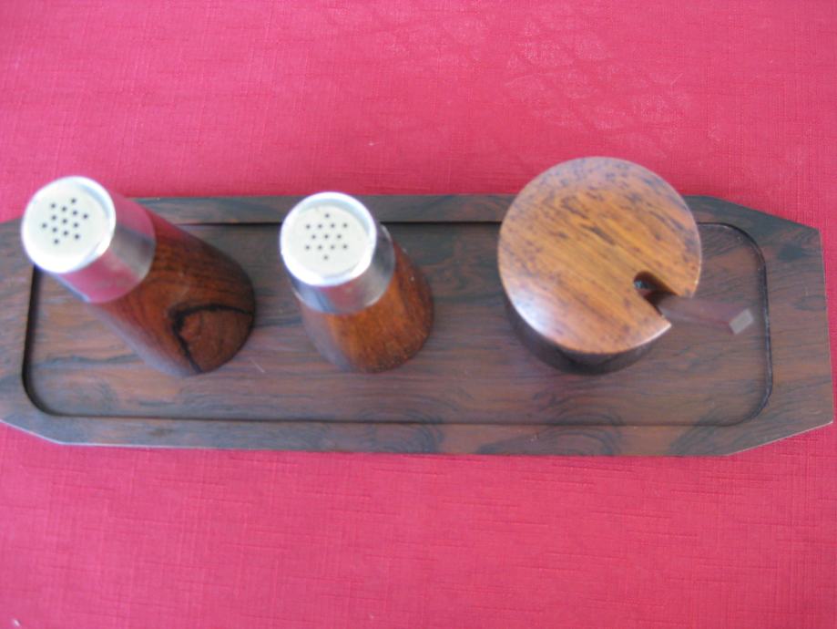 Set posudica za sol, papar i senf, na drvenom (mahagoni) podlošku