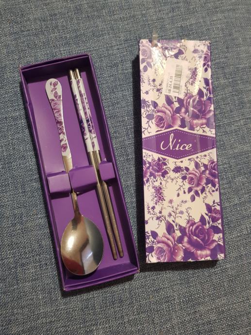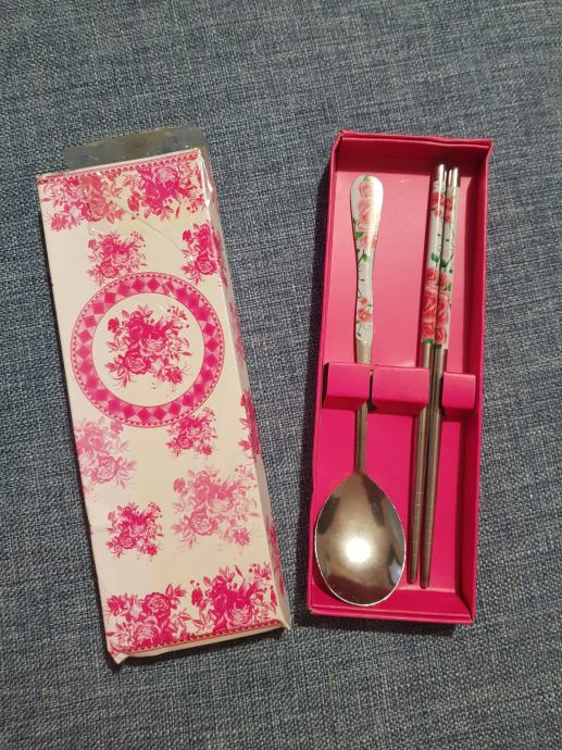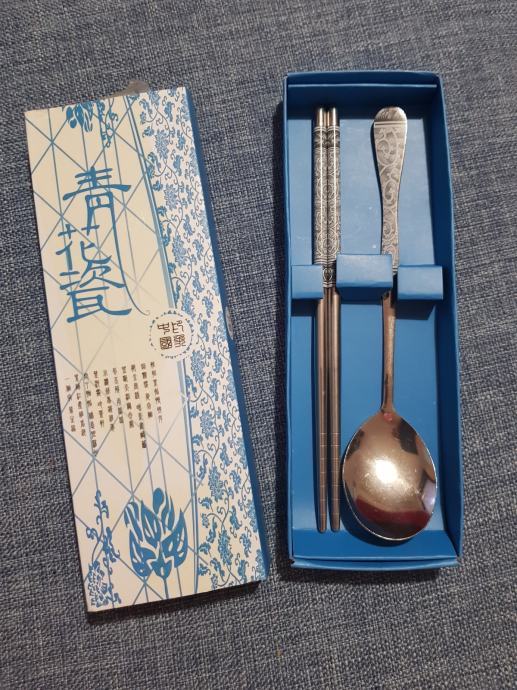 Prodajem set pribora za jelo koji se sastoji od kineskih štapića i žlice od nehrđajućeg čelika.