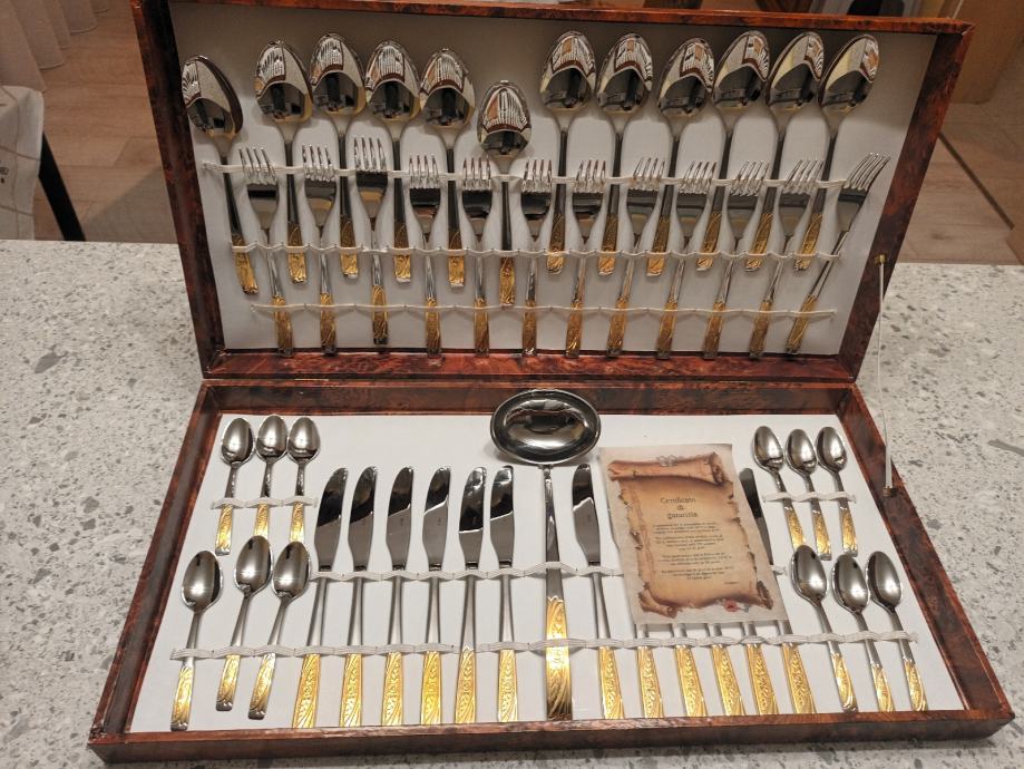 Potpuno novi, pozlaćeni priborom za jelo, za 12 osoba.