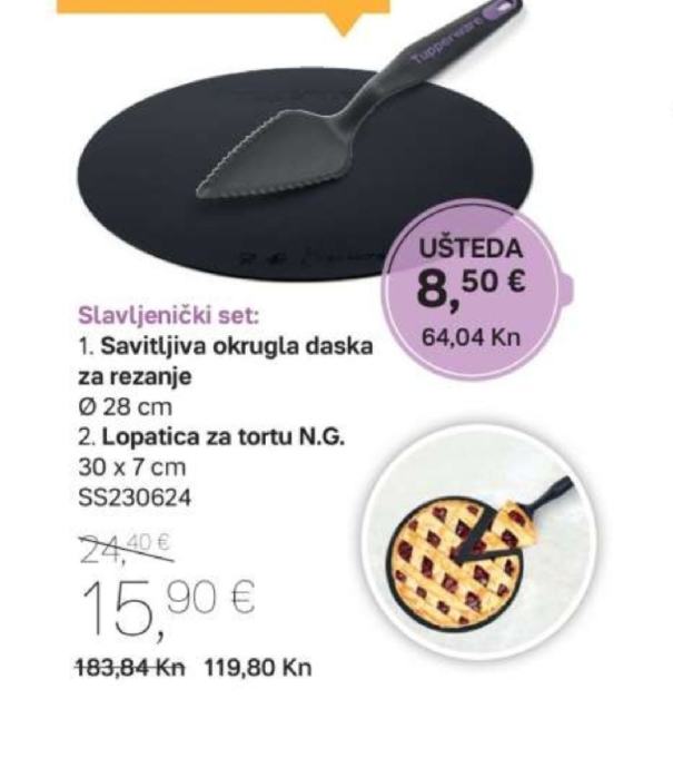Set sadrži savitljivu dasku za rezanje (idealna za vip podesivi pladanj) i lopaticu za tortu (s njom poslužujemo i režemo).