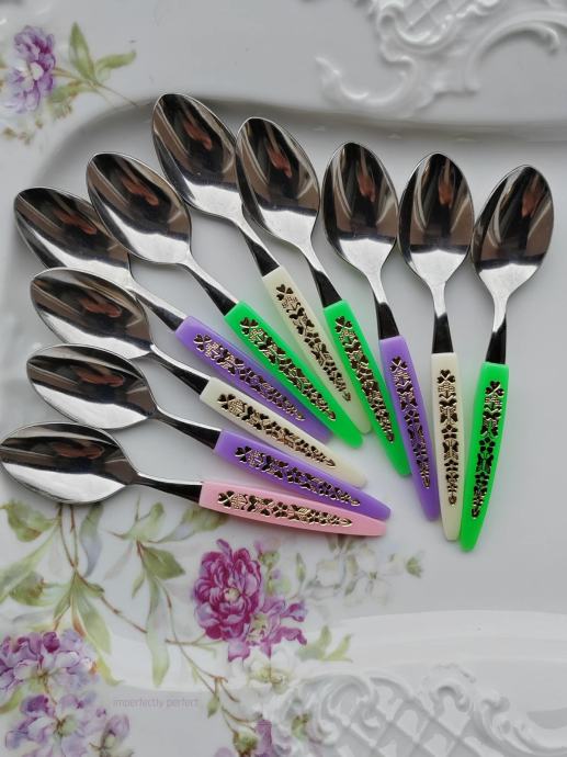 Deset nekorištenih vintage žličica s raznobojnim drškama